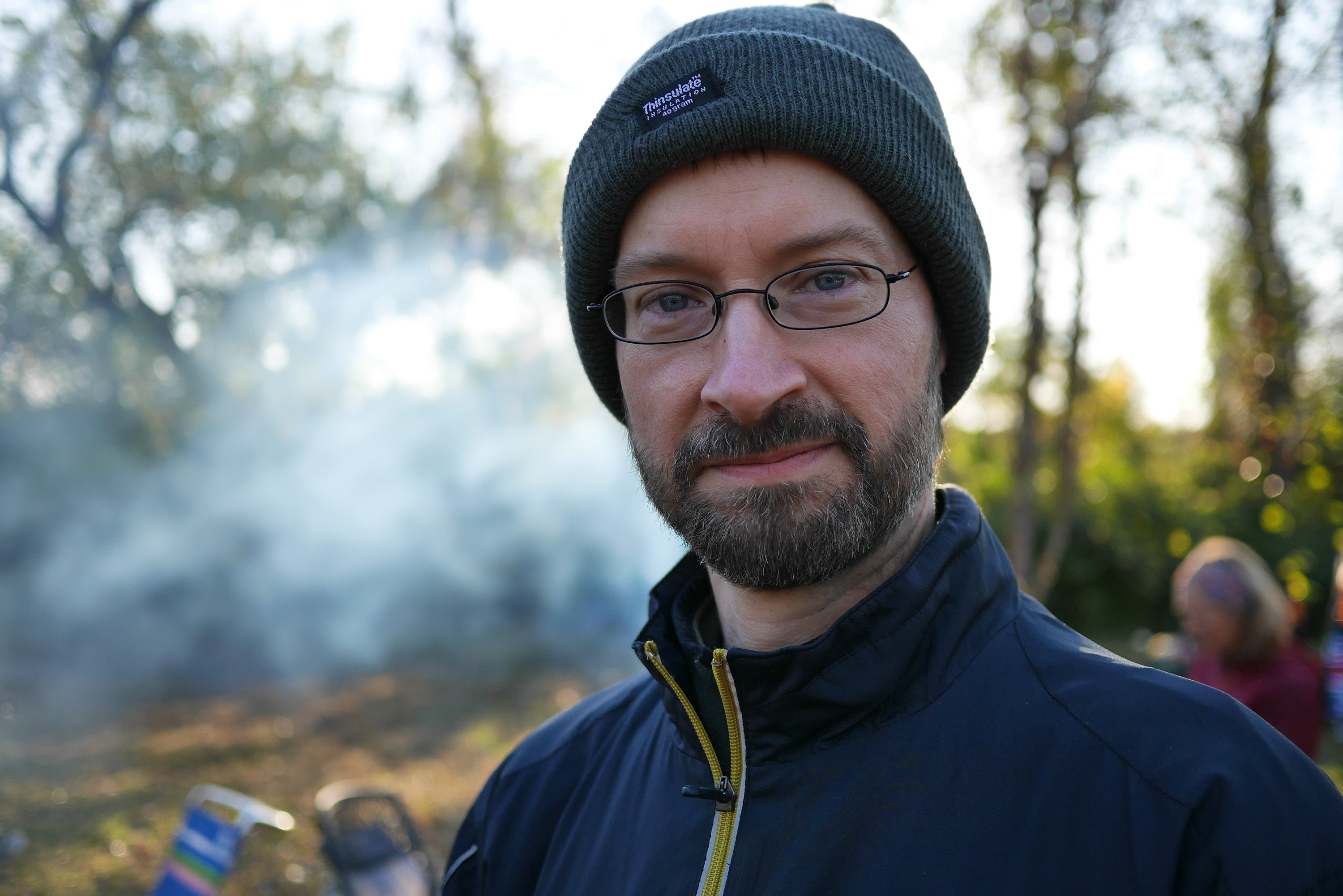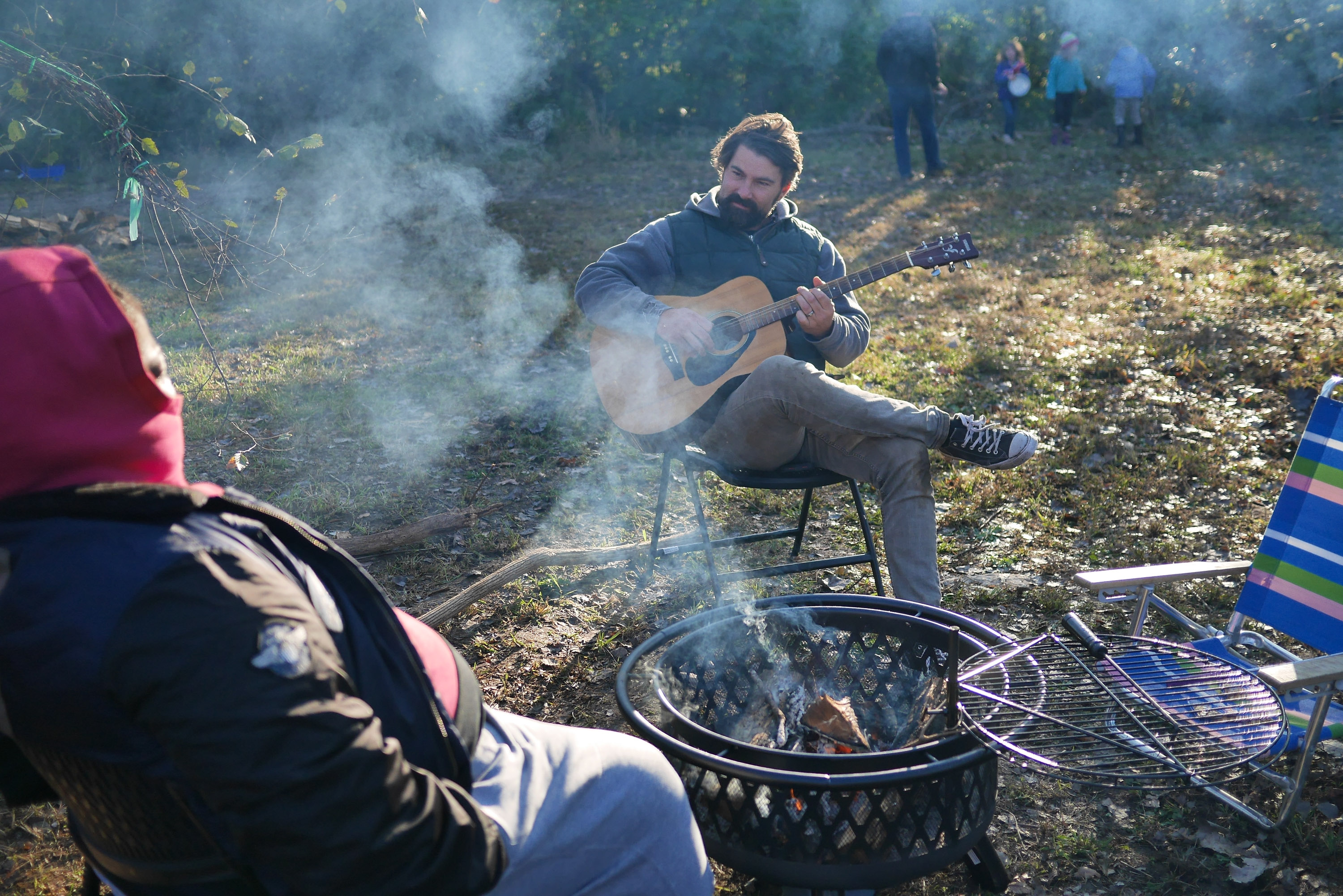 When the sun goes down, the couple dozen campers gather around the fire. Guitars appear, and so do the marshmallows. My wife Emma and I take a moment to look up at the few stars you can see through the glowing haze of the city.