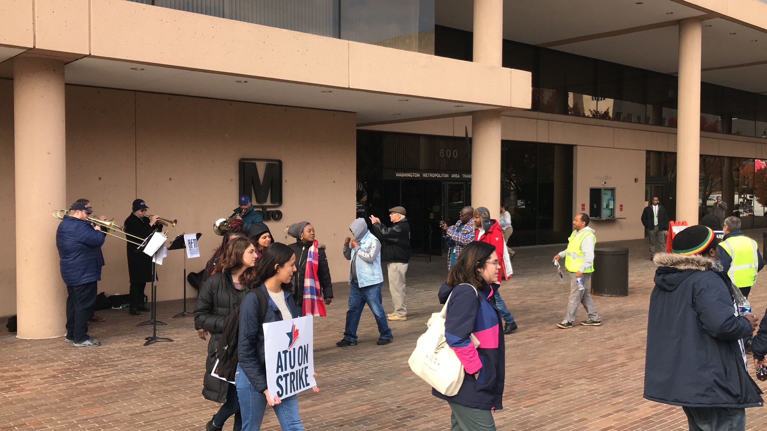 When Metro staffers filed out of the building, they encountered a brass quartet from the American Federation of Musicians, a handful of Georgetown University Young Democratic Socialists of America members, and nearly 50 bus operators and utility workers on strike against WMATA contractor Transdev. The Metrobus drivers say they are paid less per hour and receive worse benefits than public sector workers who do the same jobs.