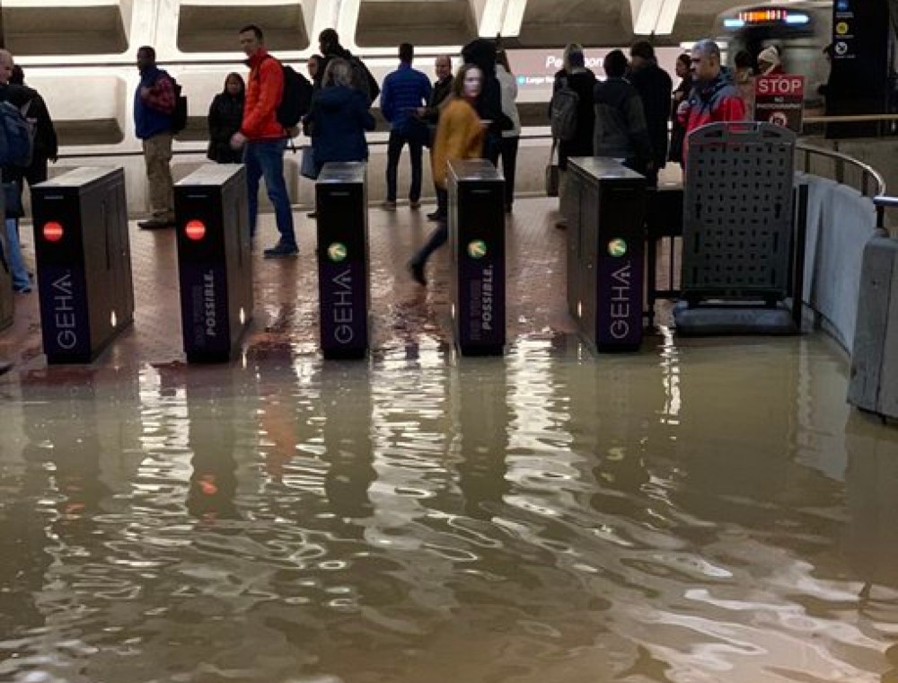 Parts of the Pentagon Metro station flooded during Monday’s morning commute, forcing some riders to slog through a pool of dirty water to exit.