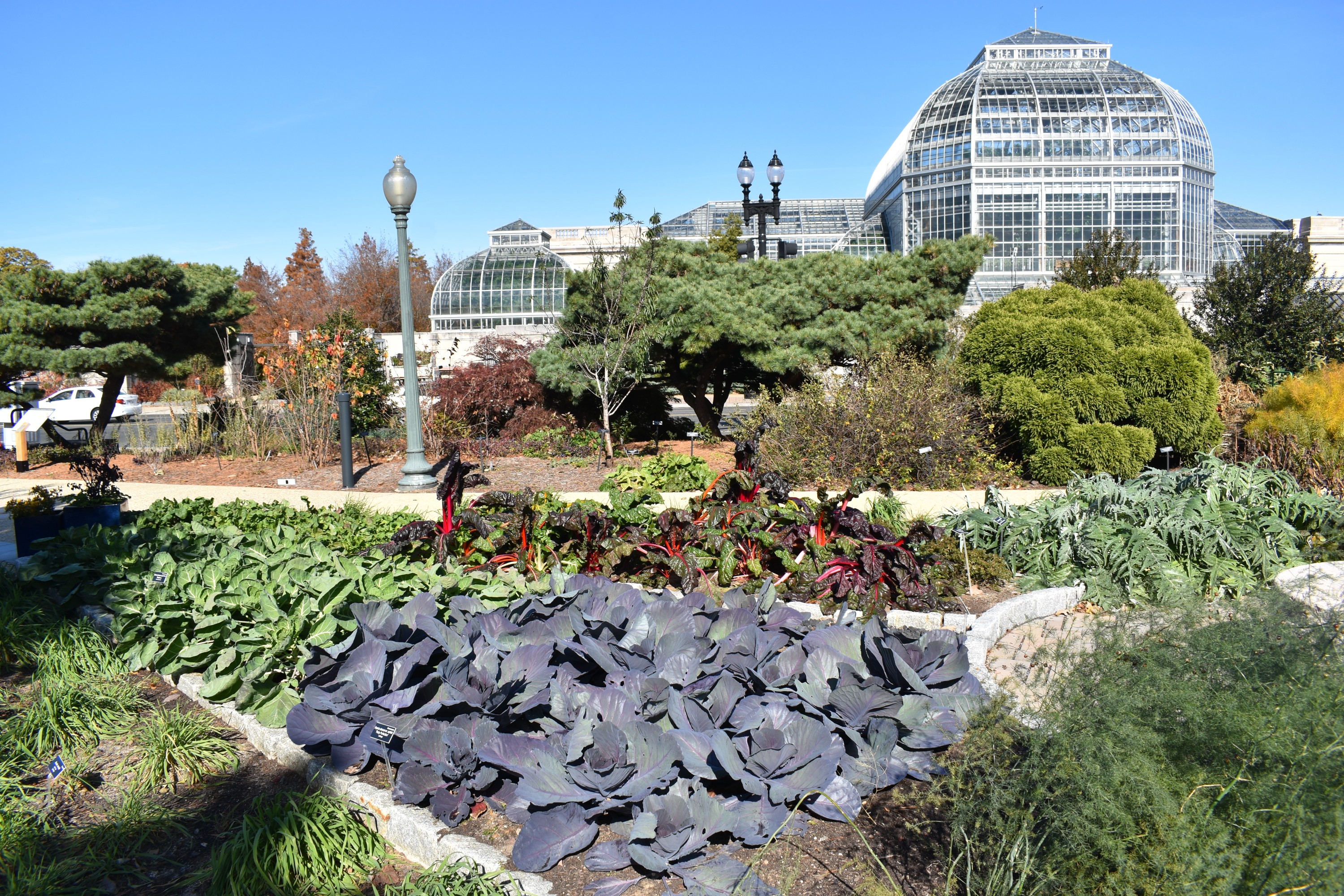 Even on a recent cold November morning, the park still brims with flowering shrubs, green-leafed plants, and specks of color. It also holds several surprises, says the Botanic Garden’s horticulturist Ray Mims, who managed the park’s 2016 redesign. Strolling through, we see several of its 10 rain gardens, a sunken area that recycles rainwater to grow plants and flowers. The largest holds a hearty collection of carnivorous plants, including the white-topped pitcher plant that snacks on wasps. In the park’s southeast corner, there’s a Georgia-native Franklinia alatamaha (yes, named after Ben Franklin) that went extinct in the wild in the early 1800s. There’s a kitchen garden with leafy kale, a paw-paw tree that bears fruit every fall, and what are believed to be the northern-most consistently fruiting pomegranate tree in the country. When asked if people often pick these yellow-crowned treats, Devin Dotson, head of the US Botanic Garden’s public programs and exhibits, sighs. “They do. But they shouldn’t!”