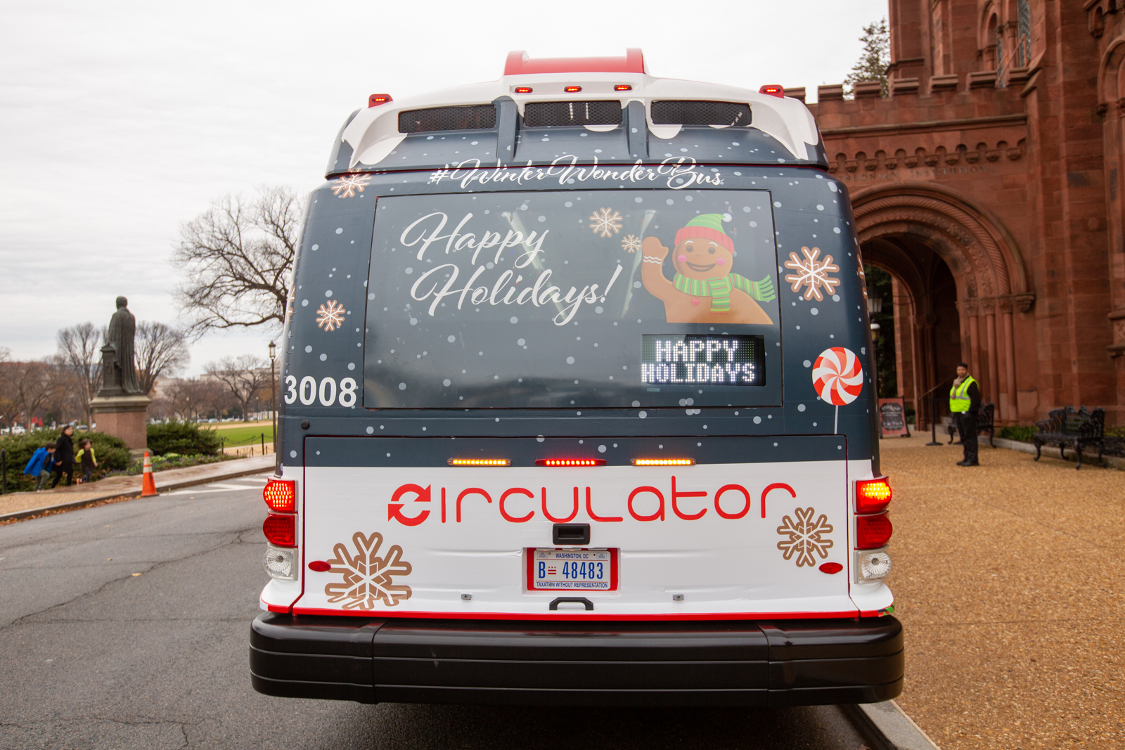 The regular red D.C. Circulator bus has transformed once again into a festive ride called the Winter Wonder Bus.