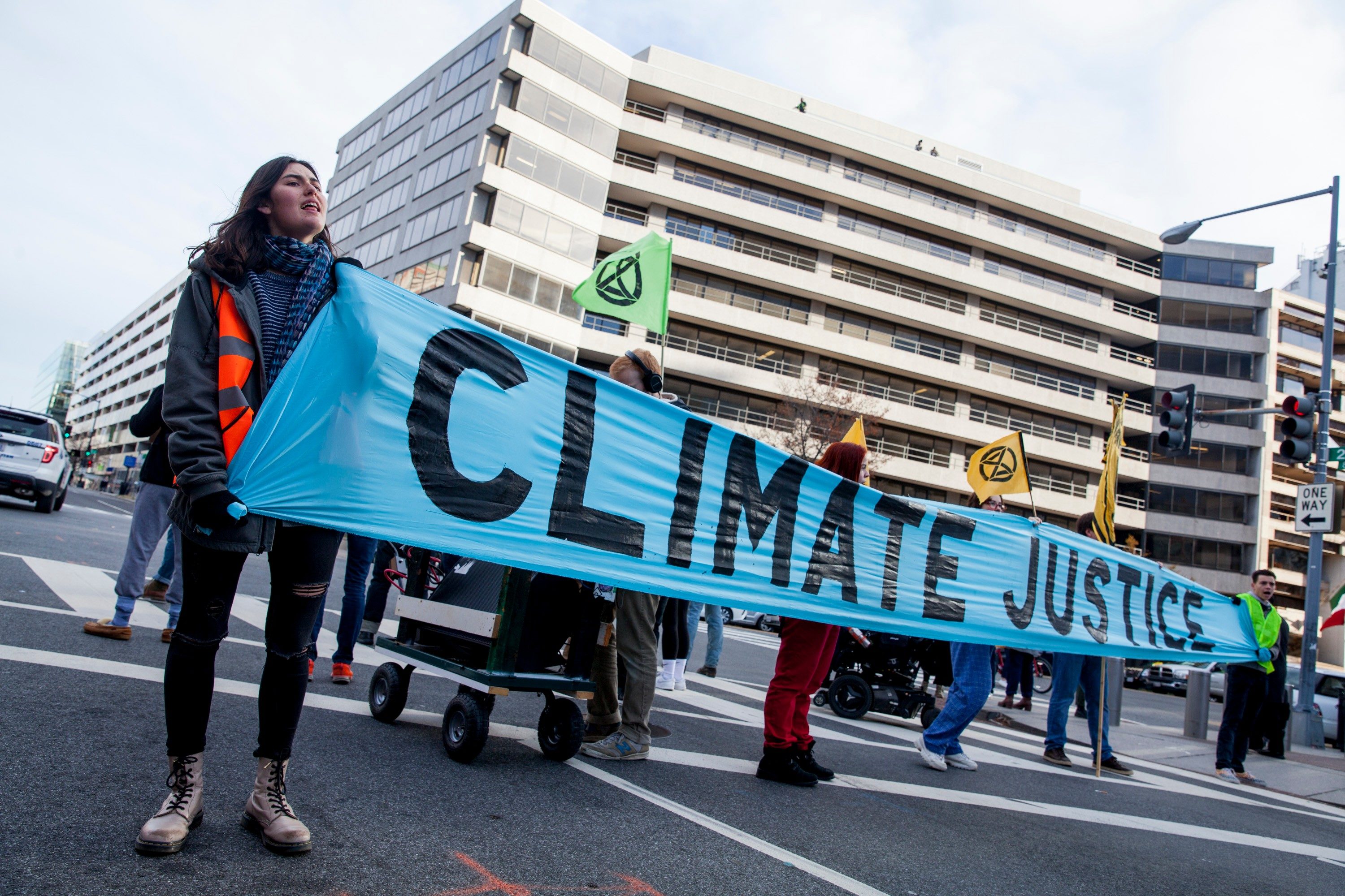 Starting around 7:30 a.m Friday morning, an alliance of climate activists and social justice groups took to the streets in the area surrounding the World Bank, blocking traffic and demanding action to reduce fossil fuels.
