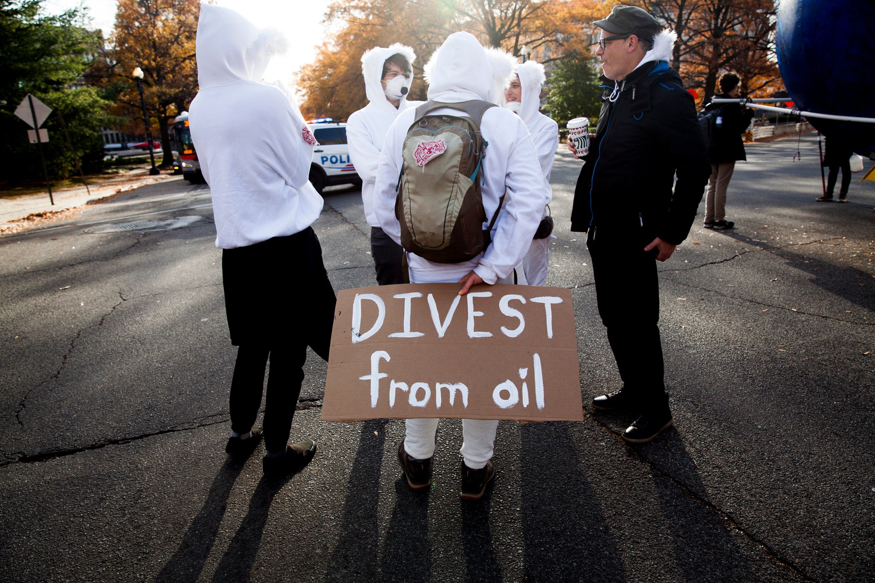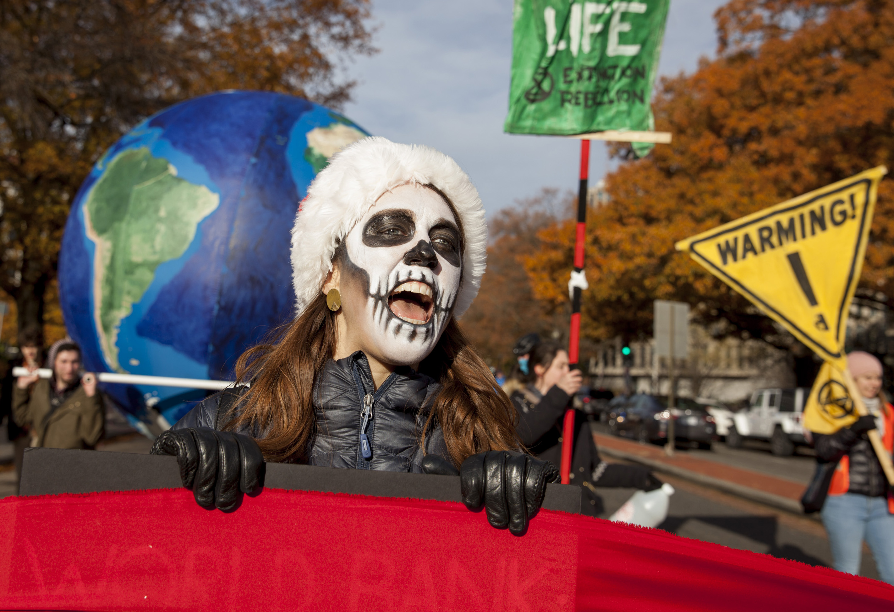 Demonstrators also blocked traffic at locations across the city, with some wearing painted-on skull masks and holdings signs that read “Divest from oil,” “Mass extinction,” and “World Bank, you’ve been naughty. Stop funding climate change.” One group of protesters carried a large Earth balloon and a “Warming!” sign. The World Bank issued an advisory to its employees about the disruptions and recommending that they work from home, according to Shut Down D.C. spokesperson Nick Brana.