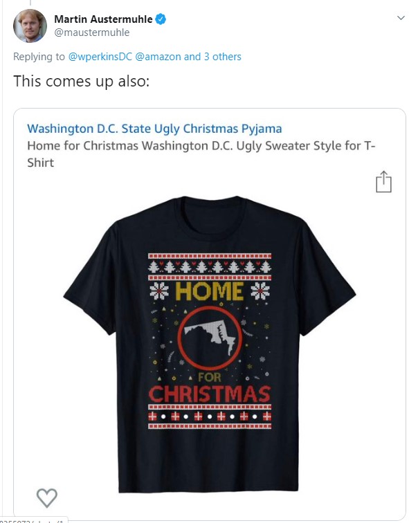 Oh boy. While Amazon lists ugly Christmas T-shirts with the correct shape for most states (because what says “Seasons Greetings” like a Mississippi state flag shirt?), we’ve got ourselves a classic Washington mixup with this tee.