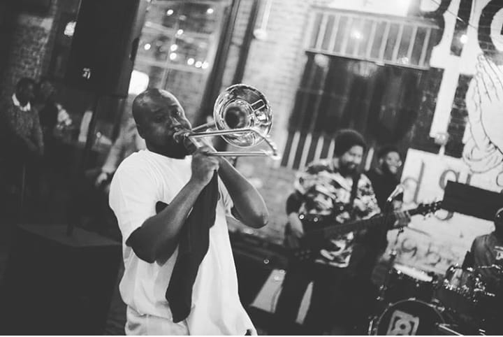 It’s Thursday night at Penn Social, a sports bar in Penn Quarter, and the so-called Trombone King is winning over the basement crowd. He hops off stage with expert showmanship and a version of “Get You” by Daniel Caesar that rivals the original, and follows it with a Stevie Wonder medley that attracts customers to mingle with strangers on the dance floor. “Feel-good-funky music,” he calls it.