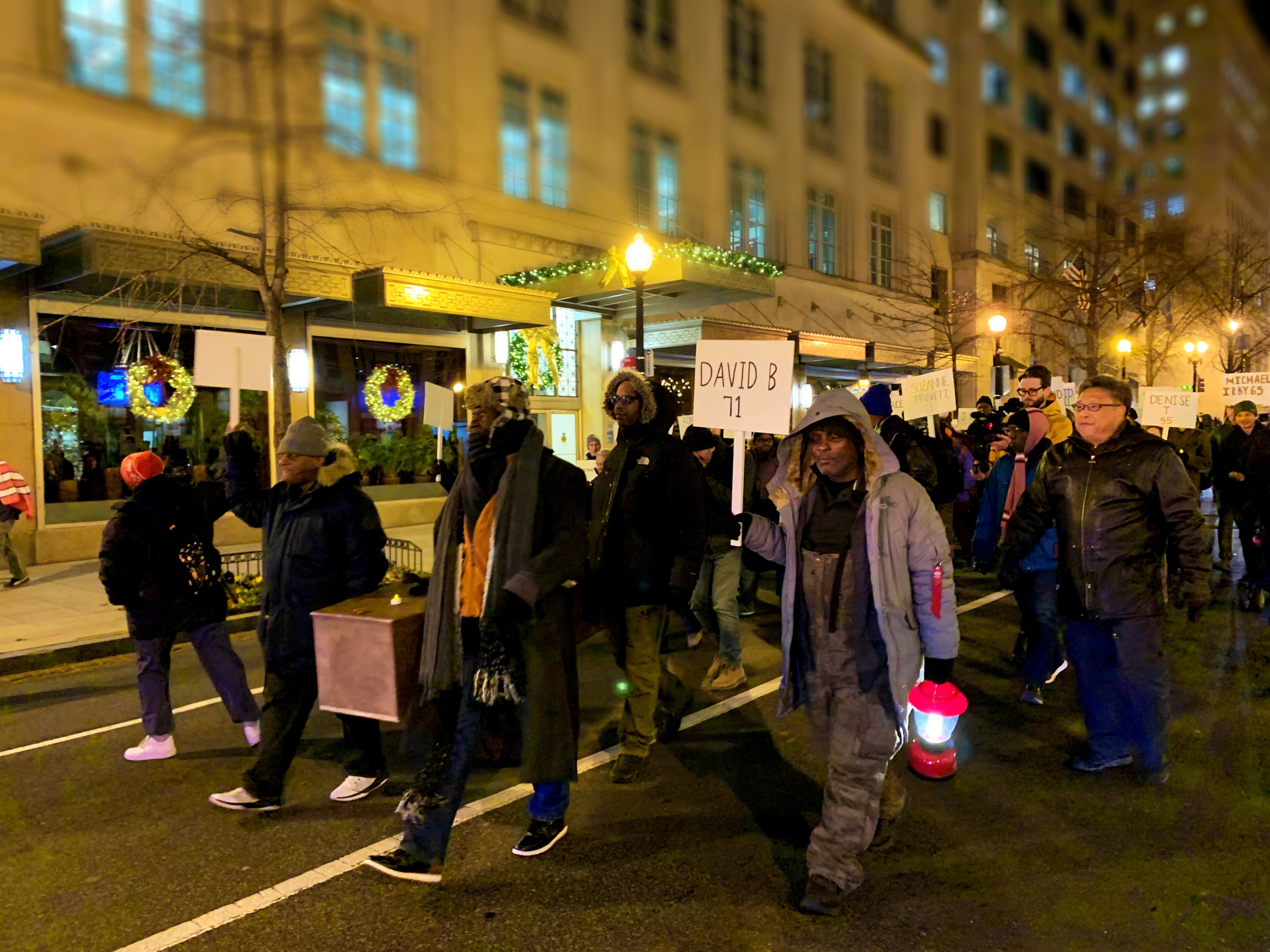 On frigid Thursday night, a crowd marched down 14th Street toward Freedom Plaza. They were of mixed ages and lived experiences, including an elderly veteran in a U.S. Army hat, young men passing handwarmers between each other, a handful of children in puffy jackets, and one trio of women with canes, arms linked together.