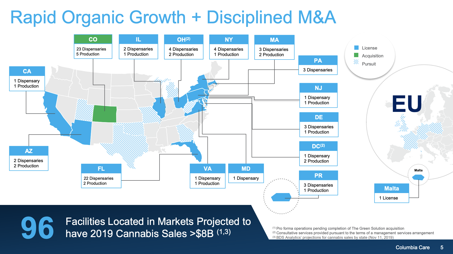 A slide in a November presentation to investors shows where Columbia Care is already active in producing and selling medical marijuana, and where it’s looking to go.