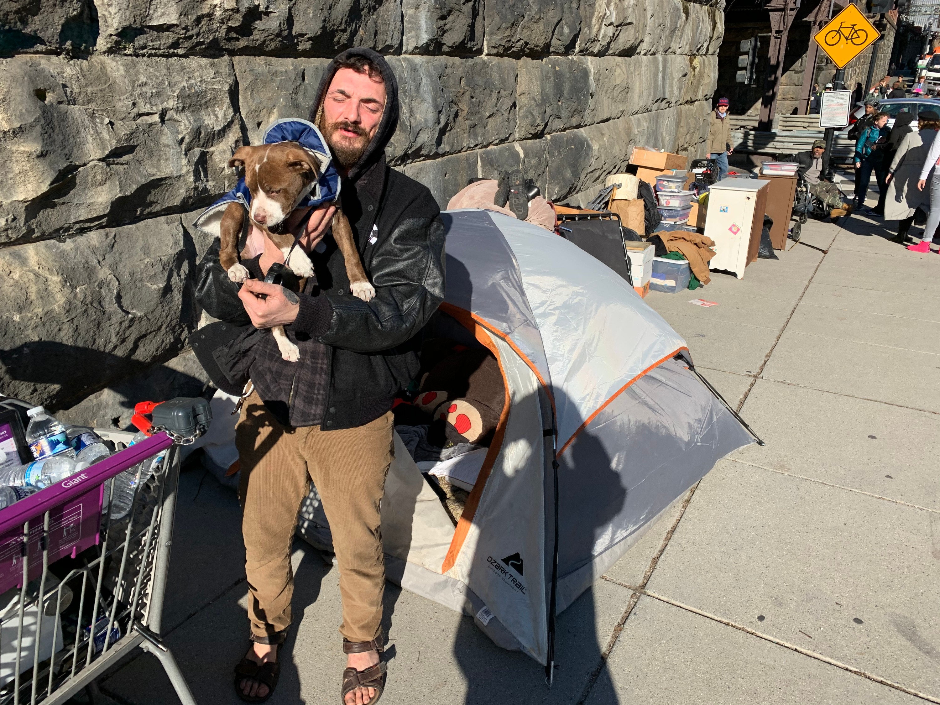 But while the larger discussion looms overhead, people who’d been living under the K Street underpass are facing the immediate pressures of displacement. By noon on Thursday, Aaron Garland was trying to figure out how to transport his pile of stuff, now sitting across the street from the Union Place luxury apartments. Word spread that a volunteer with a flatbed truck was on his way. Garland patted his puppy on the head and whispered, “Shhh. It’s okay. It’s okay.”