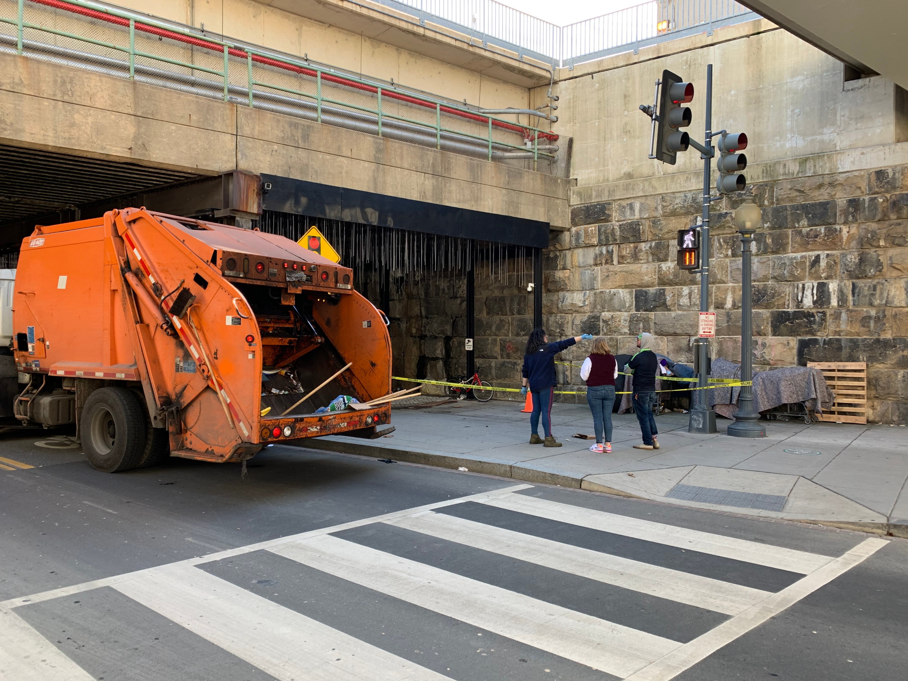 Starting at 10 a.m., police officers and Department of Public Works employees taped off the narrow outer lanes and slowly moved in dump trucks and Bobcat machines to clear anything that was left, followed by sweeping and power washing of the sidewalks. One woman who was still helping to move the tents shouted, “You will not touch this stuff,” as the clearing began. A man kicked a liter bottle of soda into the street in frustration as he continued to clear out his tent.