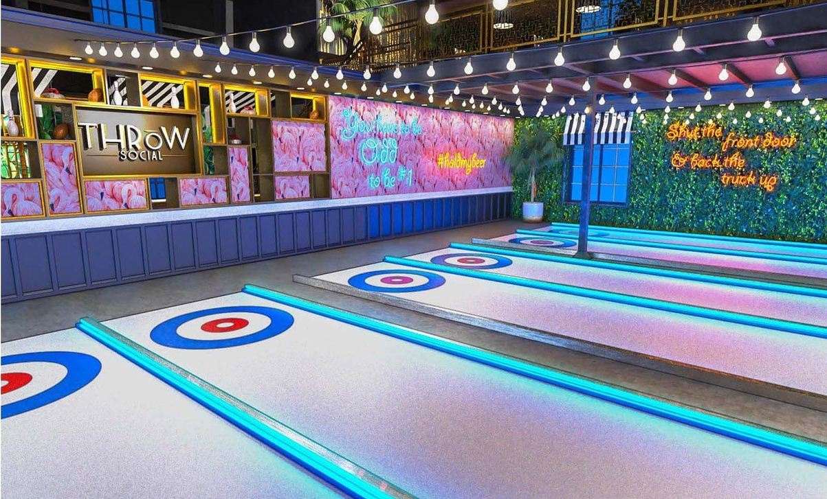 Flesher-Sonnier says Kick Axe/THRōW Social is also kid friendly: Children ages 8 and up will be welcome to use foam axes in the throwing range, and can play the curling and FootBowl games upstairs.