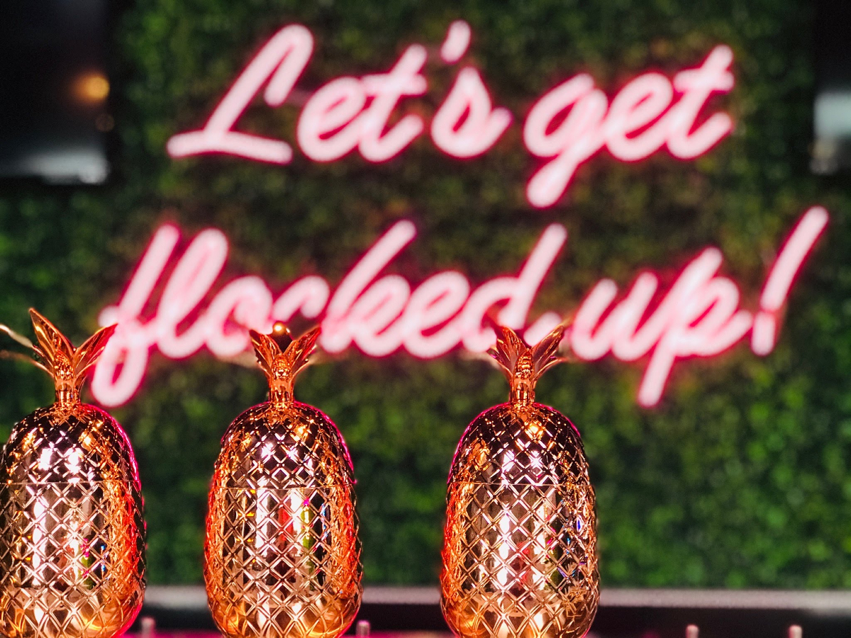 The second floor—the space that holds THRōW Social—is where the tropical atmosphere comes in. Rentable cabana lounges feature high tops, flamingo string lights, and bamboo furniture bordered by faux palm trees. Here, guests can order bottle service, personal cotton candy machines, and refillable coolers for cocktails.