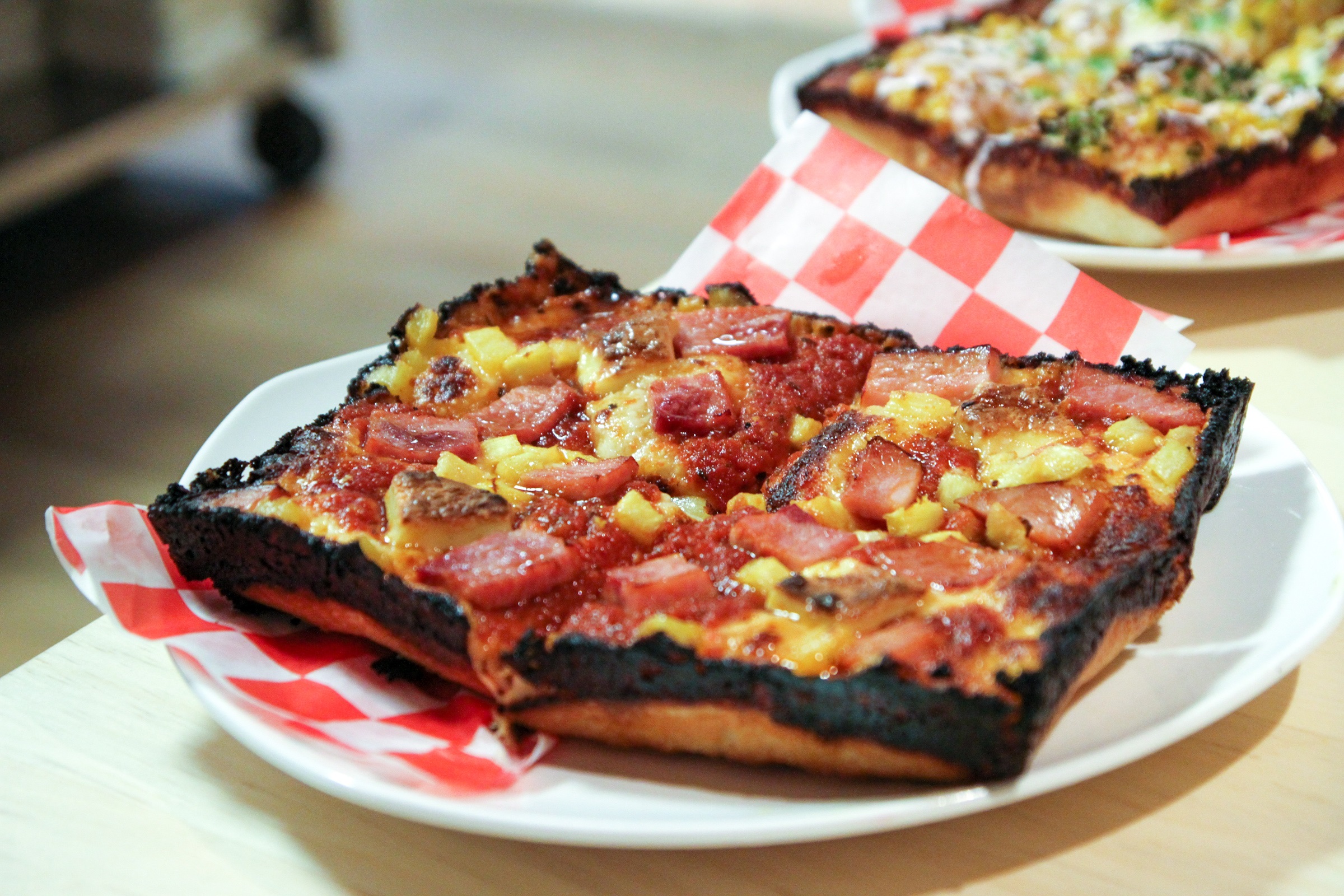 They took inspiration from Japanese bread for the final product: a fluffier, thick and chewy dough made with the mill’s Hokkaido wheat flour, baked in square pans and crisped up almost tempura-style using rice oil as a shortening. Their first menu iteration has four pies ($14-16): a pepperoni with shoyu-pickled jalapeno, a garlicky clam featuring miso and Wisconsin brick cheese, a mentaiko roe cream and Kewpie mayo pizza with corn, and a Hawaiian with hickory ham, fresh pineapple, amazu (a sweet and sour sauce) and Japanese processed cheese that costs, at $8 a pound to import, more than their fine Italian cheeses.