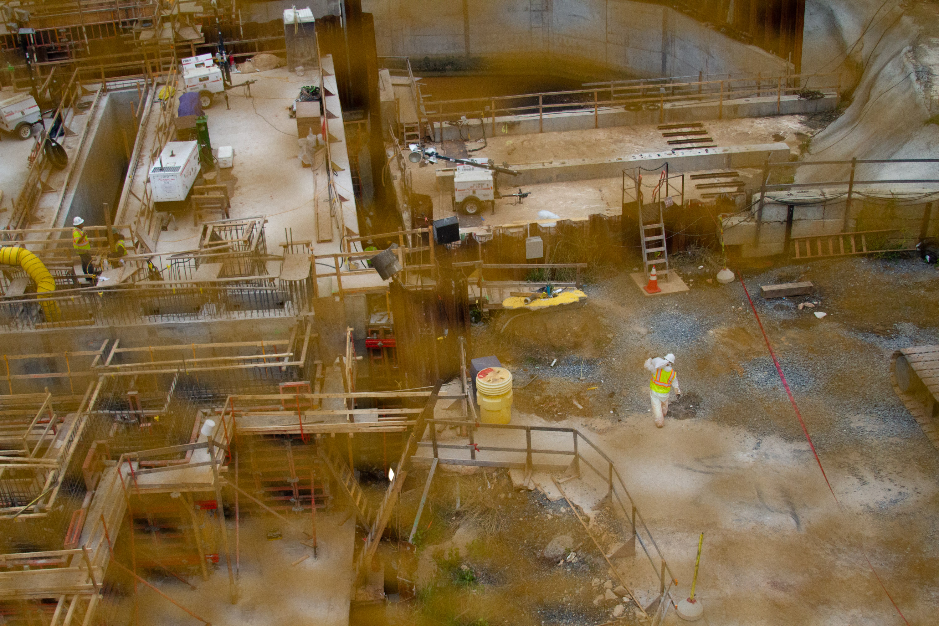 A Clean Rivers construction site near RFK Stadium, seen through a mesh cage being lowered by crane into the tunnel.