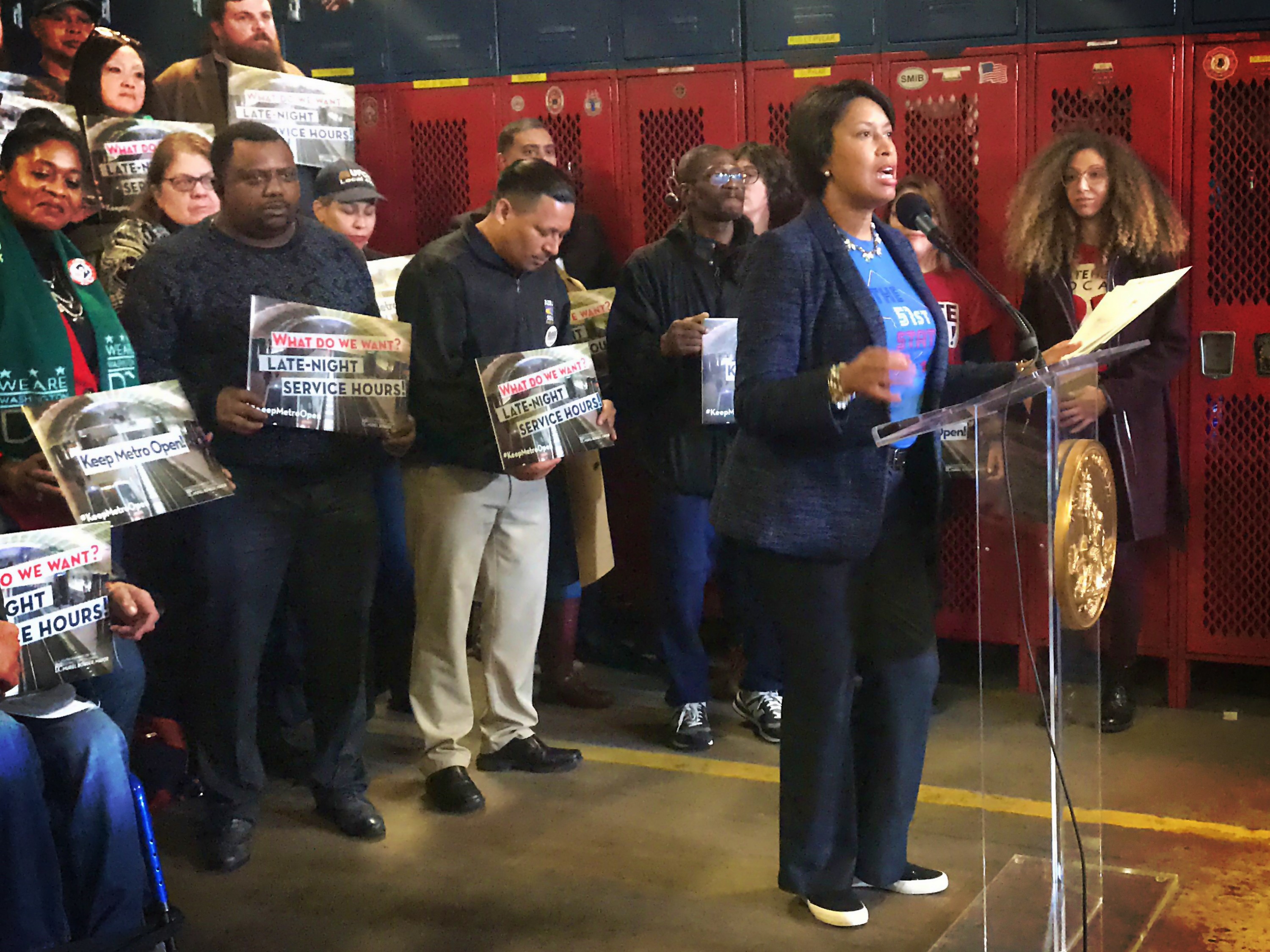In an unusual move, the mayor held a public rally on Wednesday in support of restoring late service across the street from a public hearing on the transit agency’s budget. Flanked by late night workers and business owners who say they’re affected by the hour cuts, Bowser made an impassioned case for the restoration of the system’s old hours.