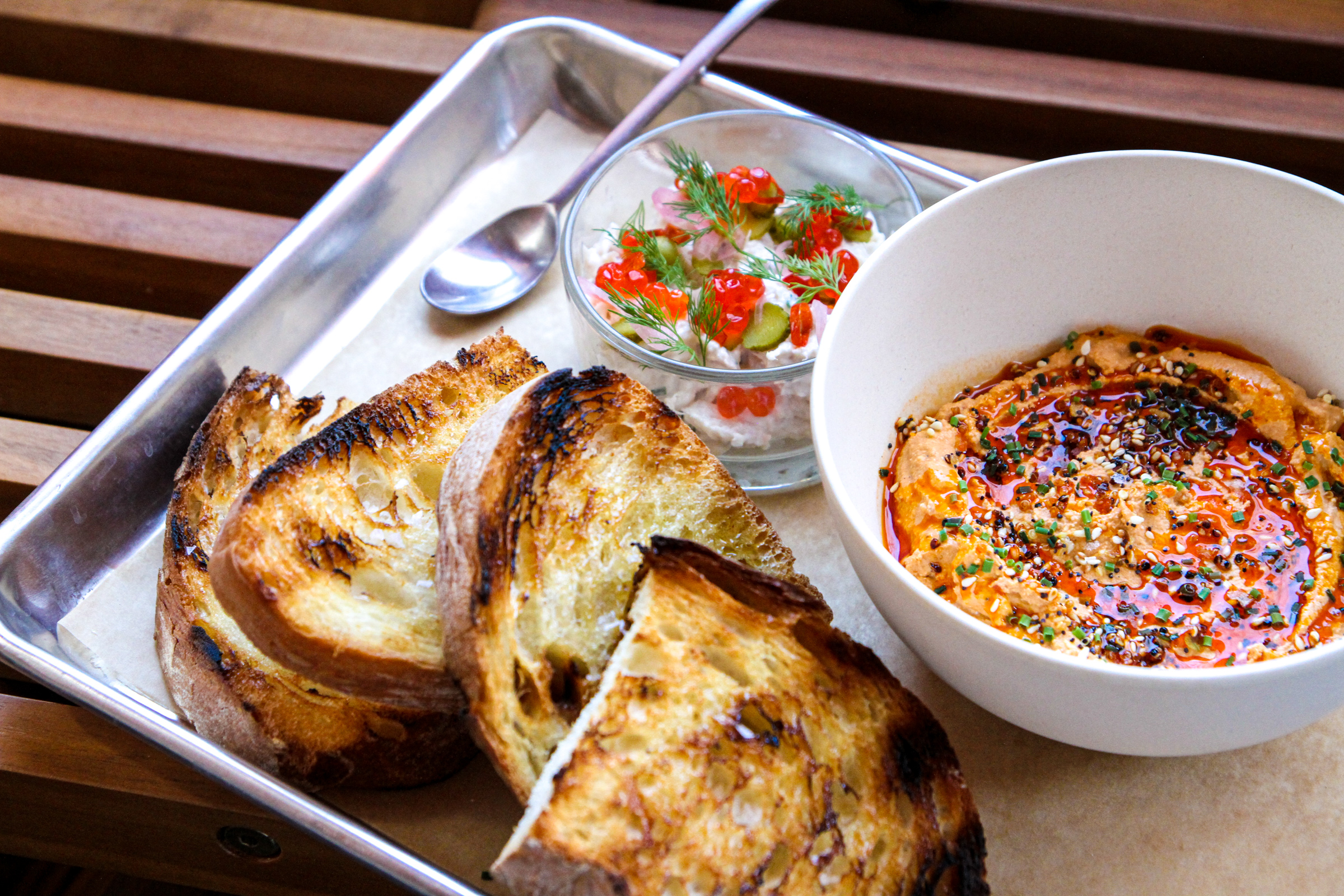 The bar swaps full sit-down dinners with proteins and sides for more casual fare. Dips and spreads are a star feature. Smith’s white queso dip is spiced by roasting green chiles, a citrus smoked whitefish has dots of ruby roe, and feta is whipped into New Mexican chile harissa for a creamy spreadable heat. Fried tostadas from Ula Tortilla in Virginia and thick-cut grilled bread serve as vessels for cleaning the bowl. The tostada is also a bittersweet stand-alone dish with crab, avocado, grapefruit, and yuzu Old Bay aioli.