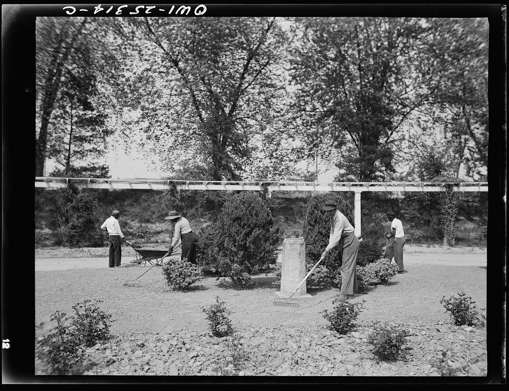 During World War II the Botanic Garden hired African American women for the first time due to a manpower shortage. Here, four female employees tend to the rose garden (circa 1942-45).