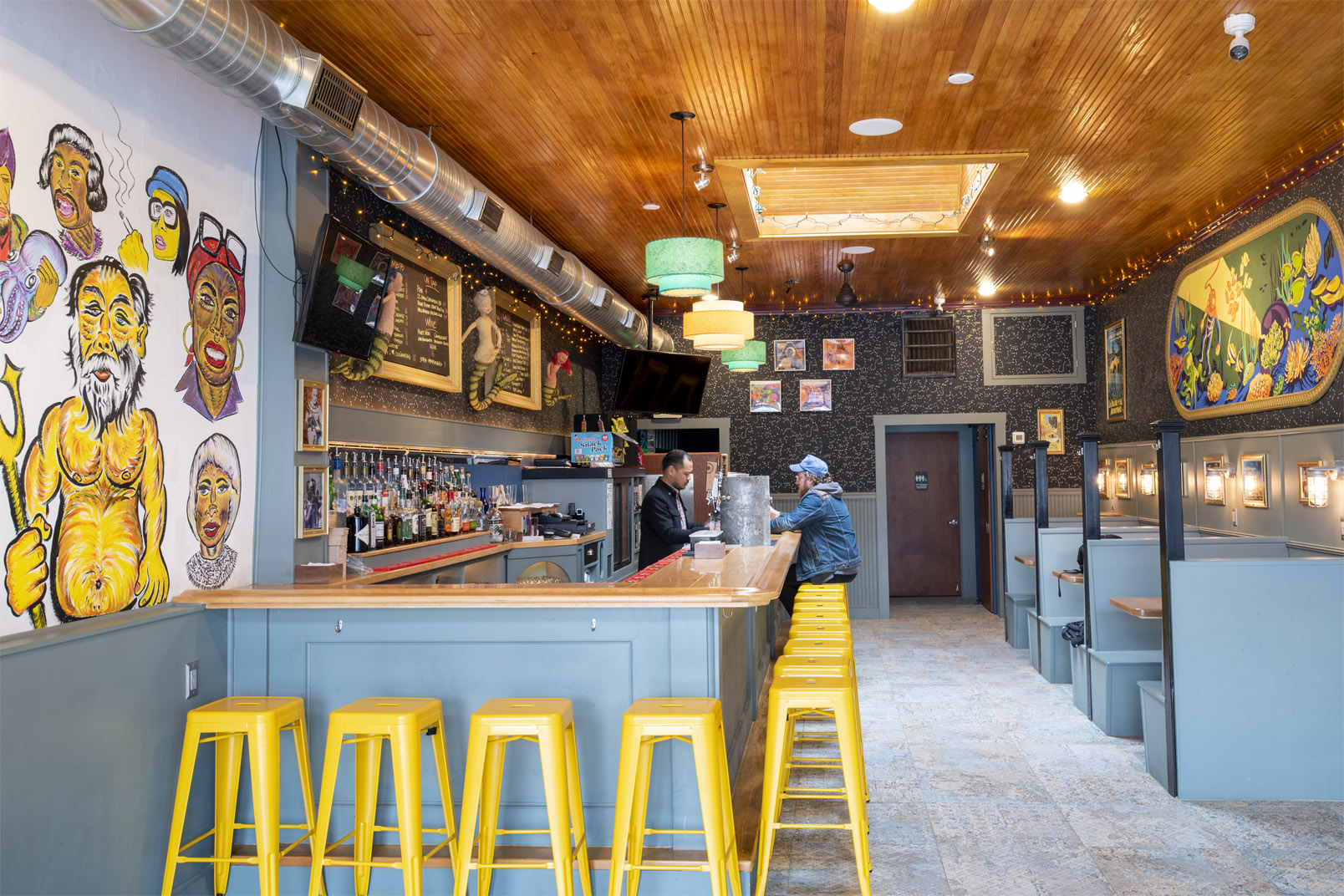 New Orleans-based musician and artist Benjy Ferree, from Prince George’s County, created the mural you’ll first notice to left as you walk in. (It gets extra trippy once the blacklight goes on.) Ex Hex drummer Laura Harris, who also works at Neptune Room a few nights a week, made the retro diving scene above the three booths on the right. (The Diver Dan-like person, outfitted in standard diving dress, became the bar’s logo.)
