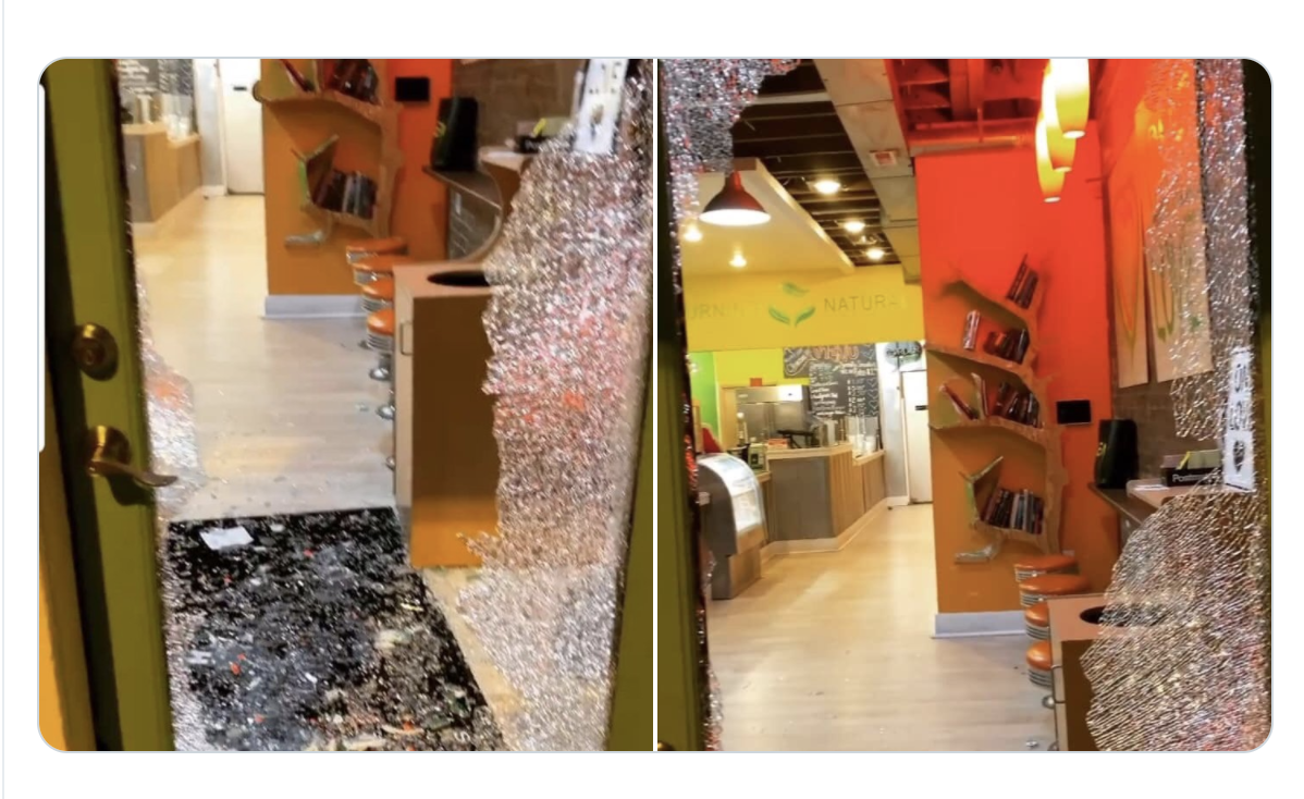 Across the street, Busboys and Poets also had its store vandalized, but owner Andy Shallal tells DCist the suspect left with nothing of significance. According to D.C. police reports, security cameras caught a hooded man shattering the window with a rock and running off with an empty cash drawer. The same had happened at Turning Natural just six minutes prior, according to the reports.
