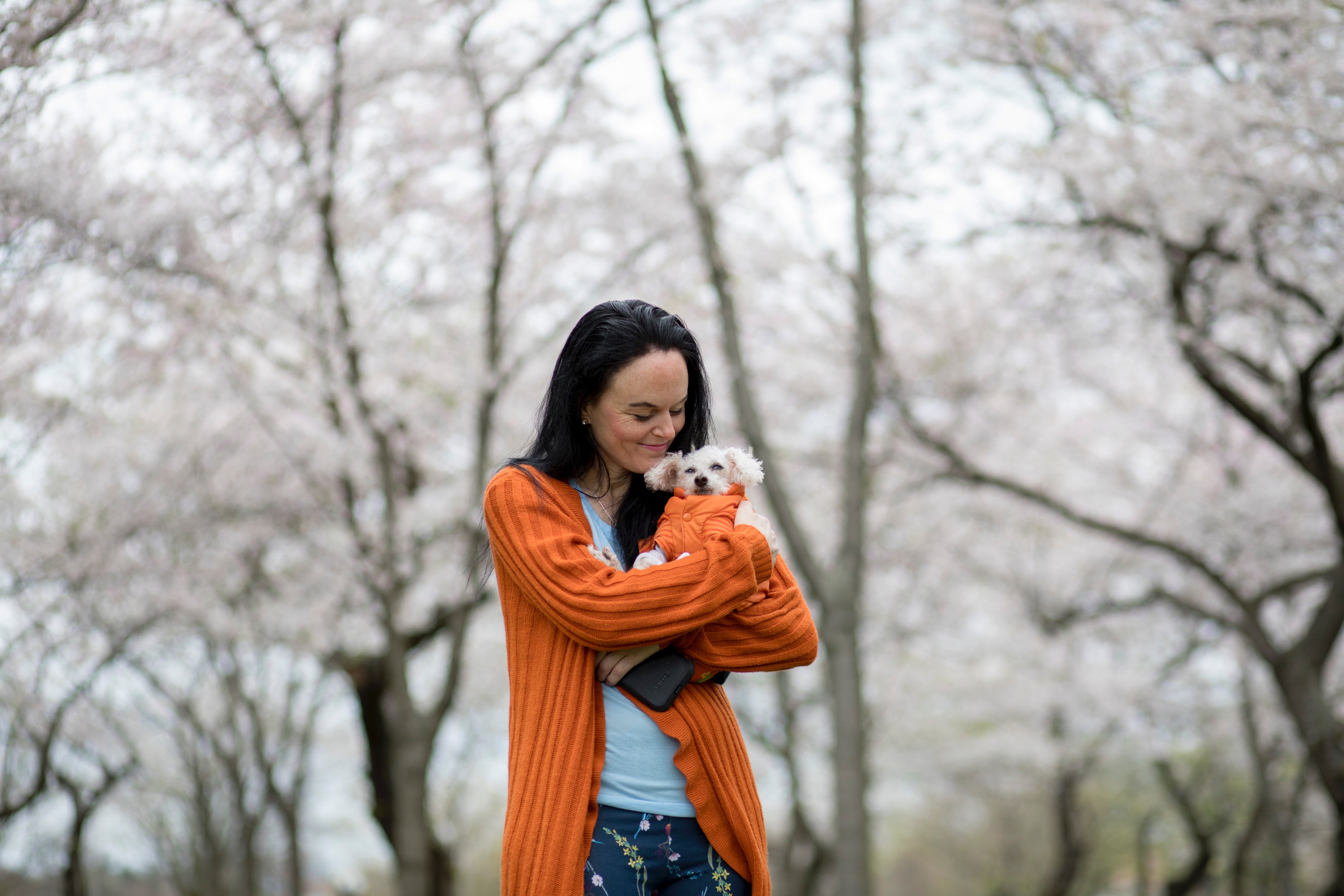 Anna and Moe Blake were wearing matching orange sweaters, posing beneath a grove of cherry trees near the Washington Monument. Moe is a tiny dog. They’re in town from Alabama, where Anna is a server at Red Robin. The restaurant is closed now, so here she is, staying in a hotel—where she sanitized every surface—and ordering takeout.