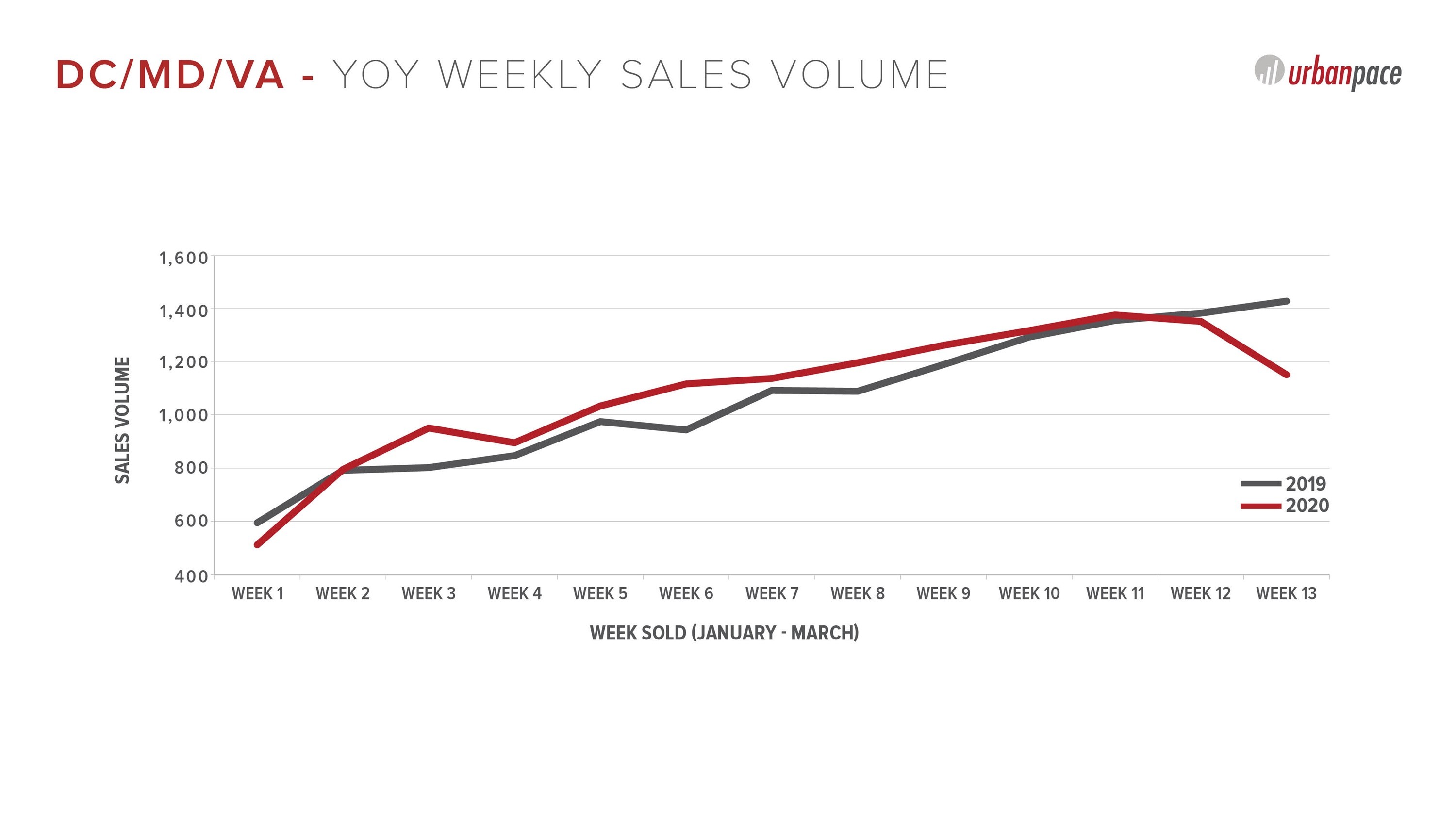 Q1 2020 started stronger than 2019 and was on track for a record quarter as it neared the start of the spring market. Sales volume slightly dipped from the COVID-19 news and shutdowns across the metro area in Week 12 but really began showing effects in Week 13 with a larger decrease in volume. Sales volume in week 13 decreased by 19.5% compared to the same week in 2019. Q1 2020 sales volume totals still outpaced Q1 2019 sales by 2.3%.Courtesy of Urban Pace