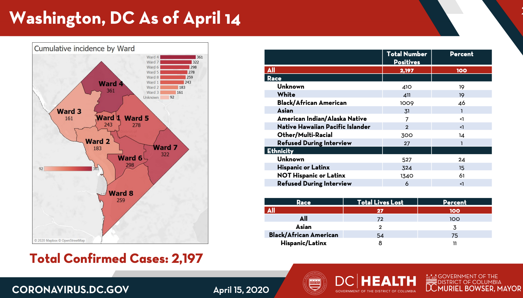 By Wednesday morning, the District’s total number of confirmed cases reached 2,197, with 72 deaths. Across D.C., Maryland, and Virginia, the death toll has surpassed 600.