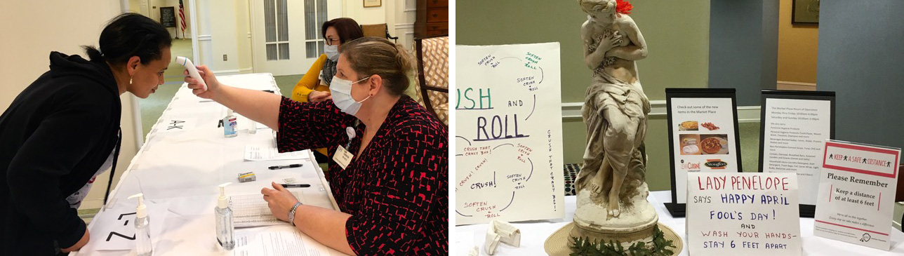 Signs of the times. Left, a staff member has her temperature taken upon arrival in the building on March 16. Right, reminders about safety protocols on April 1.