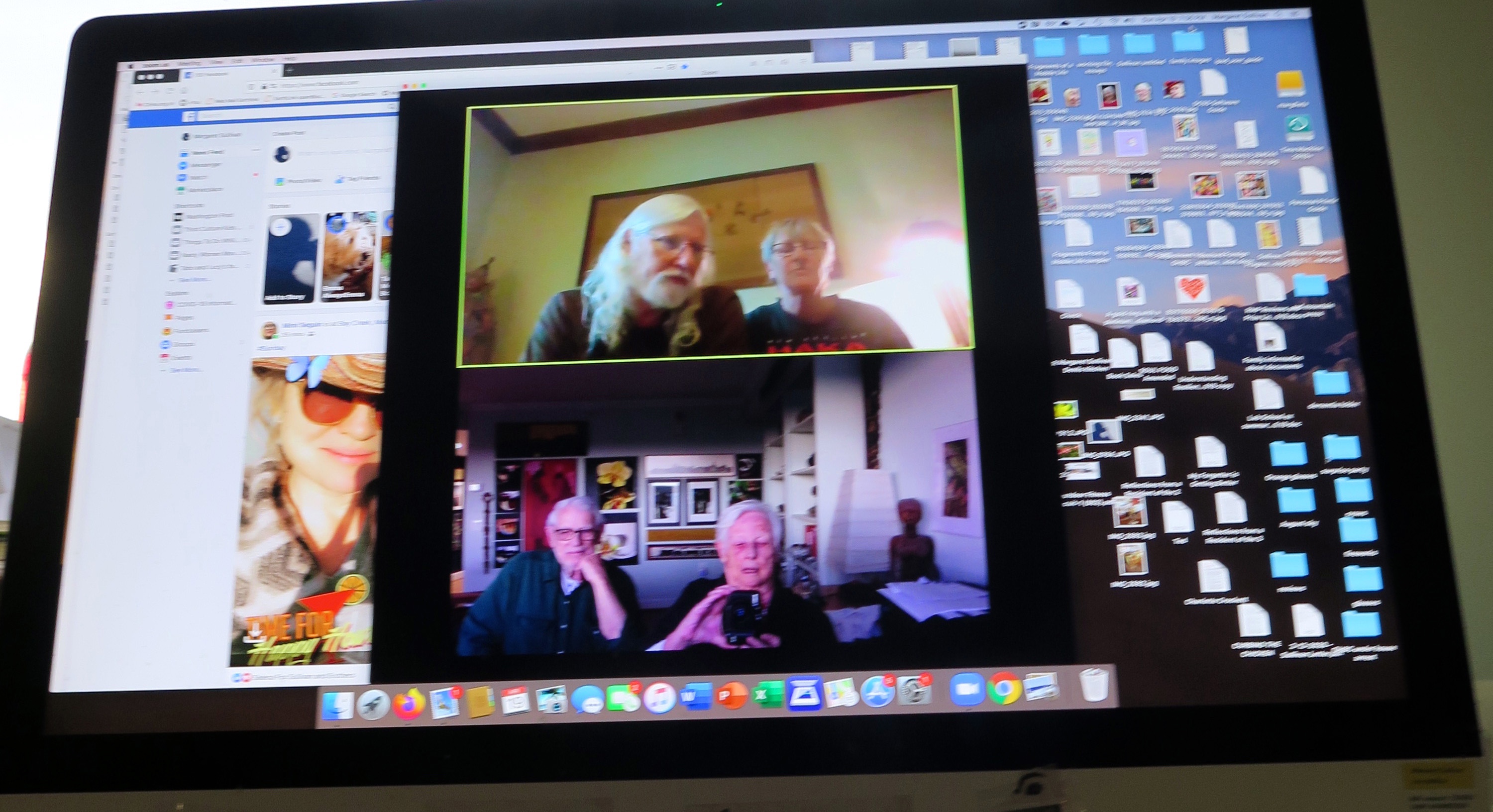 “Zooming on Sunday night with number one son, Jerry (who is a professor of anthropology at Collin Collage in Texas) and his wife Phillipa who live in McKenney, Texas,” writes Margaret. “We are talking with each of our four kids (adult children) this way. And having drinks with friends sometimes.”