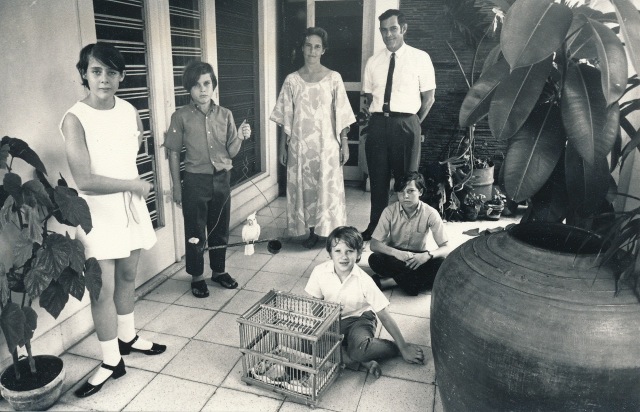 Margaret and Dan, with their children on their front porch in Jakarta in 1969 or 1970. Left to right: kids Gay, Walter, Charley (with Kaka the pet cockatoo), and Jerry.