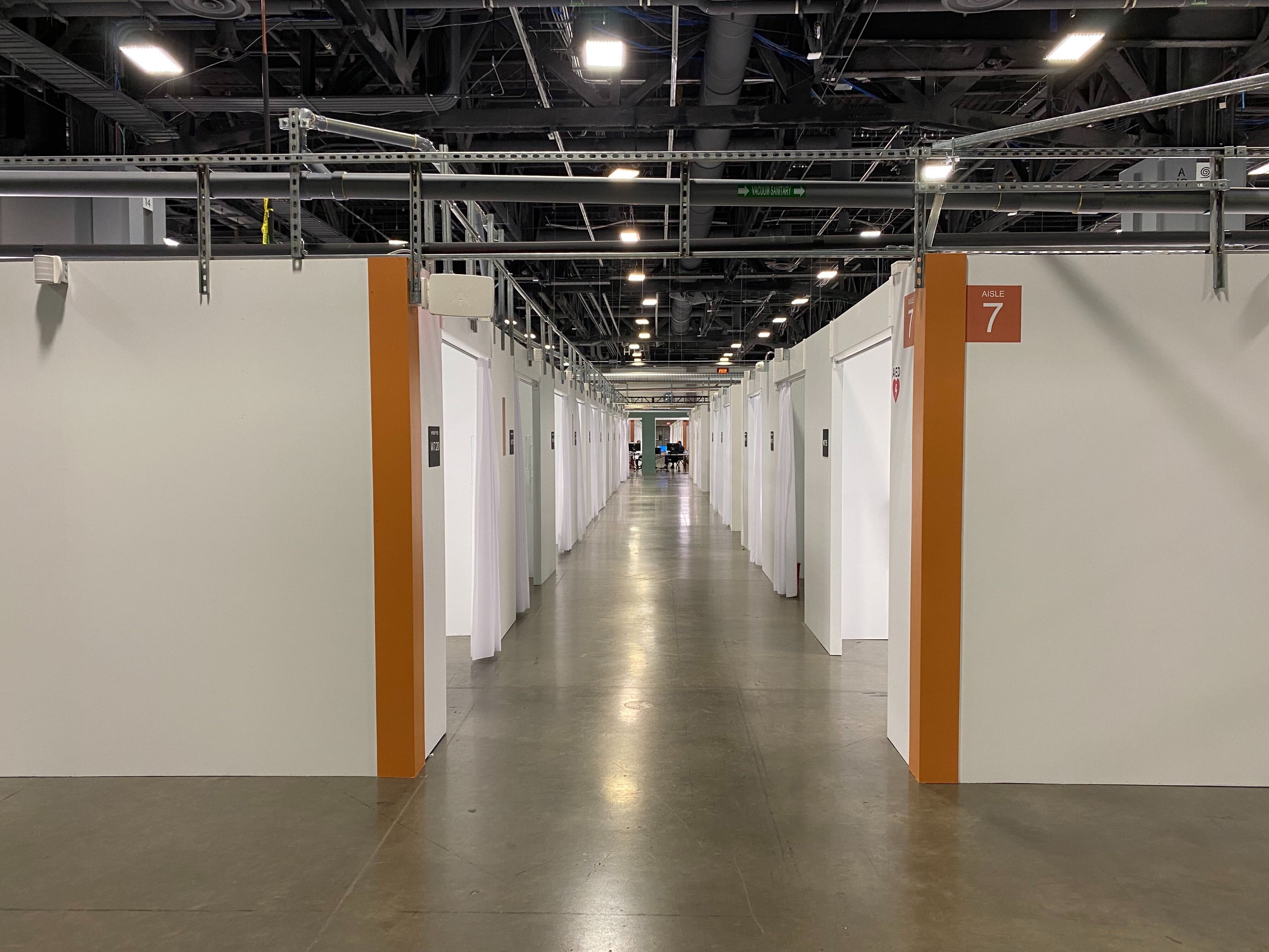 The field hospital has 437 100-square-foot rooms where COVID-19 patients can be brought if local hospitals run out of beds. There are also six specialized rooms for patients who need specialized care.