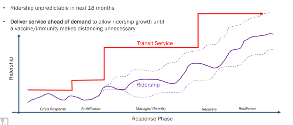“While ridership demand is difficult to predict for the next 12-18 months, our goal is to increase service in stages — ahead of demand — to maintain social distancing for customers to the extent possible,” Metro officials wrote in a brief to the board.