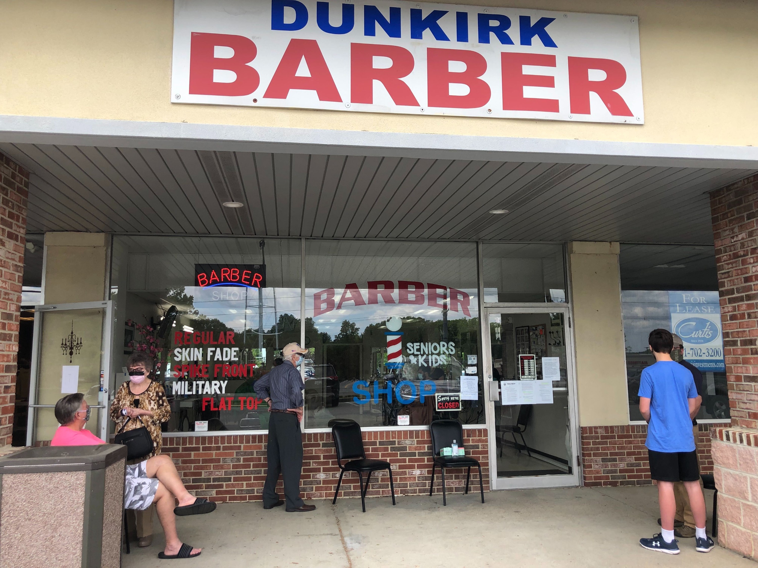 In orderly, red and white lettering, the glass front to the Dunkirk Barber shop advertises regular, skin fade, spike front, military, and flat top haircuts. And on a bright Saturday morning, it could make good on that promise for the first time in two months.