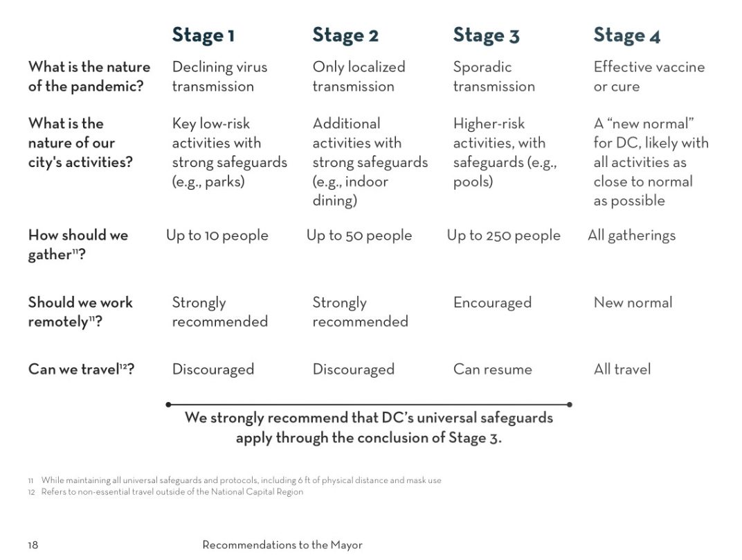 The group’s co-chairs—former National Security Advisor Susan Rice and former U.S. Secretary of Homeland Security Michael Chertoff—outlined the factors the District would consider in deciding whether to trigger the reopening plan, which has four phases. They include trends in the number of new COVID-19 cases, testing capacity, contact tracing, and the local healthcare system’s capacity for patients.
