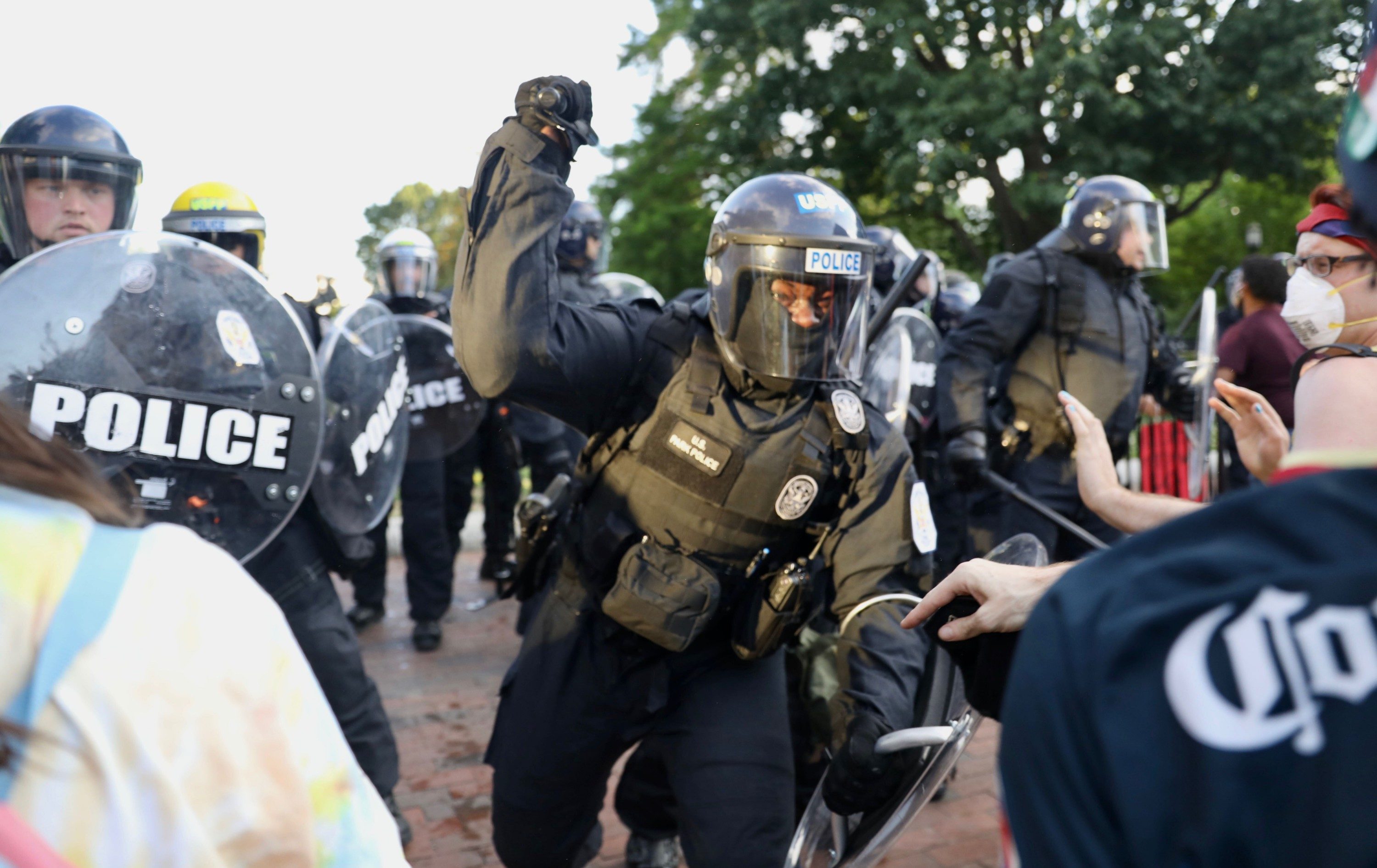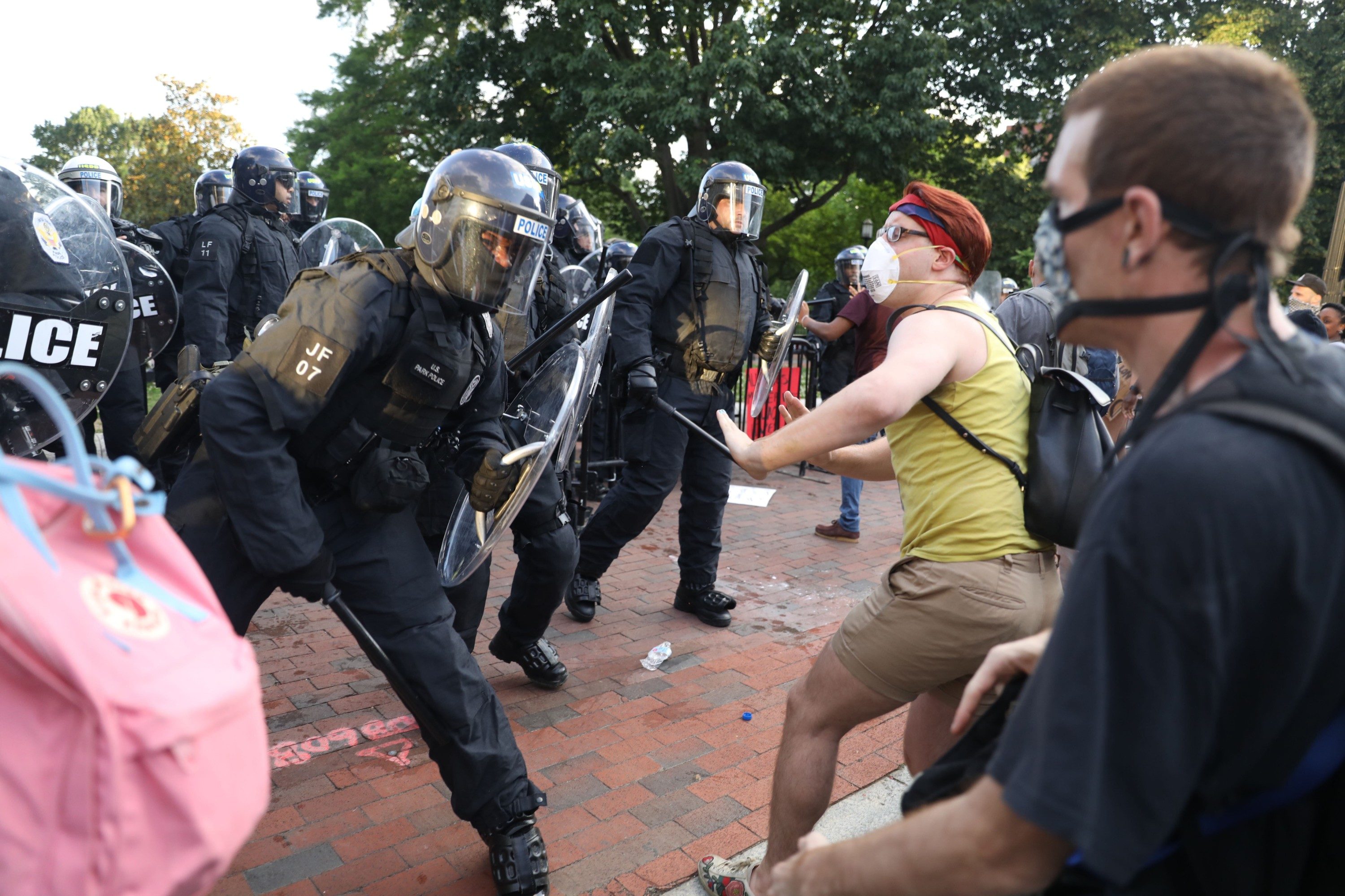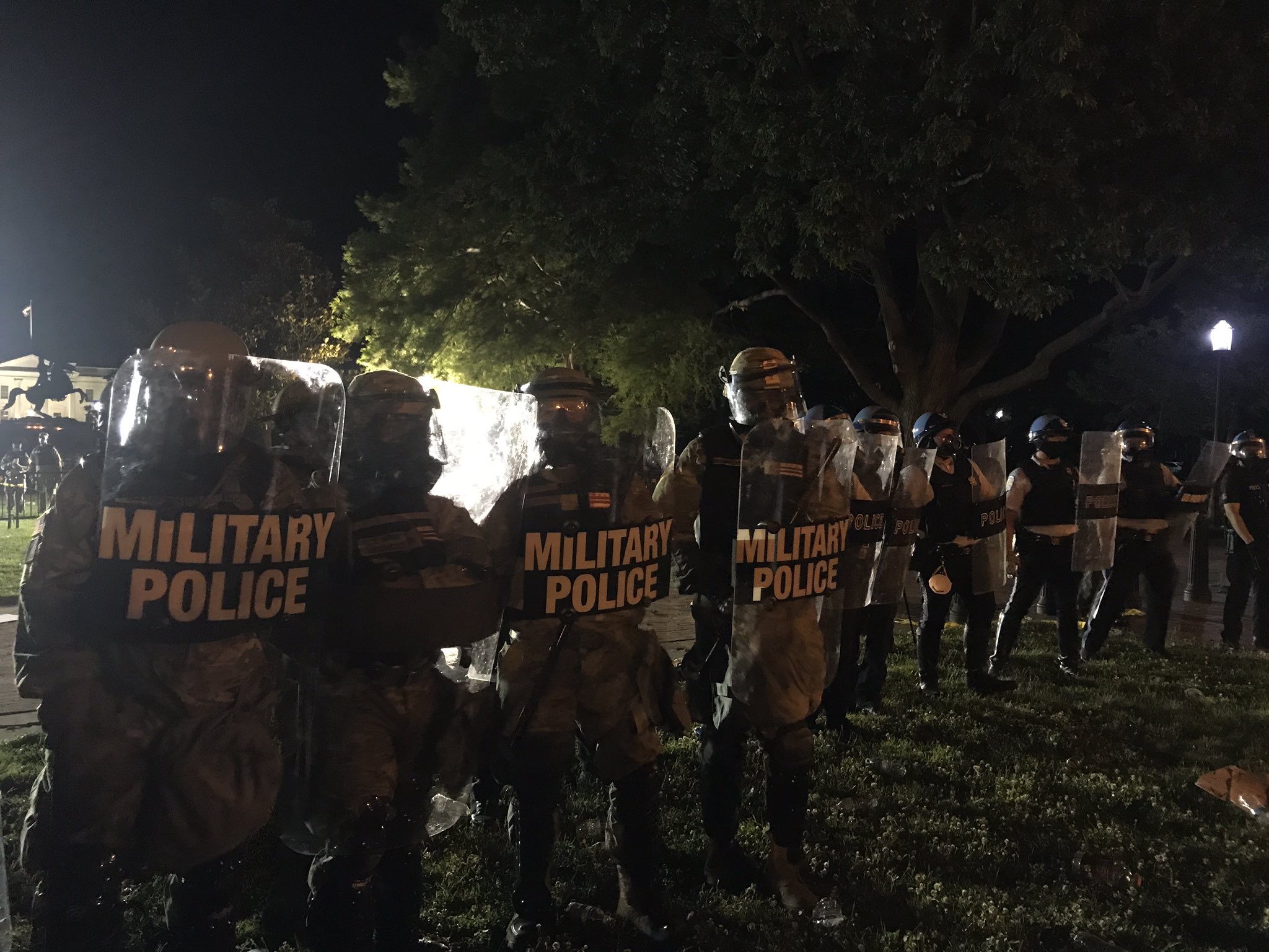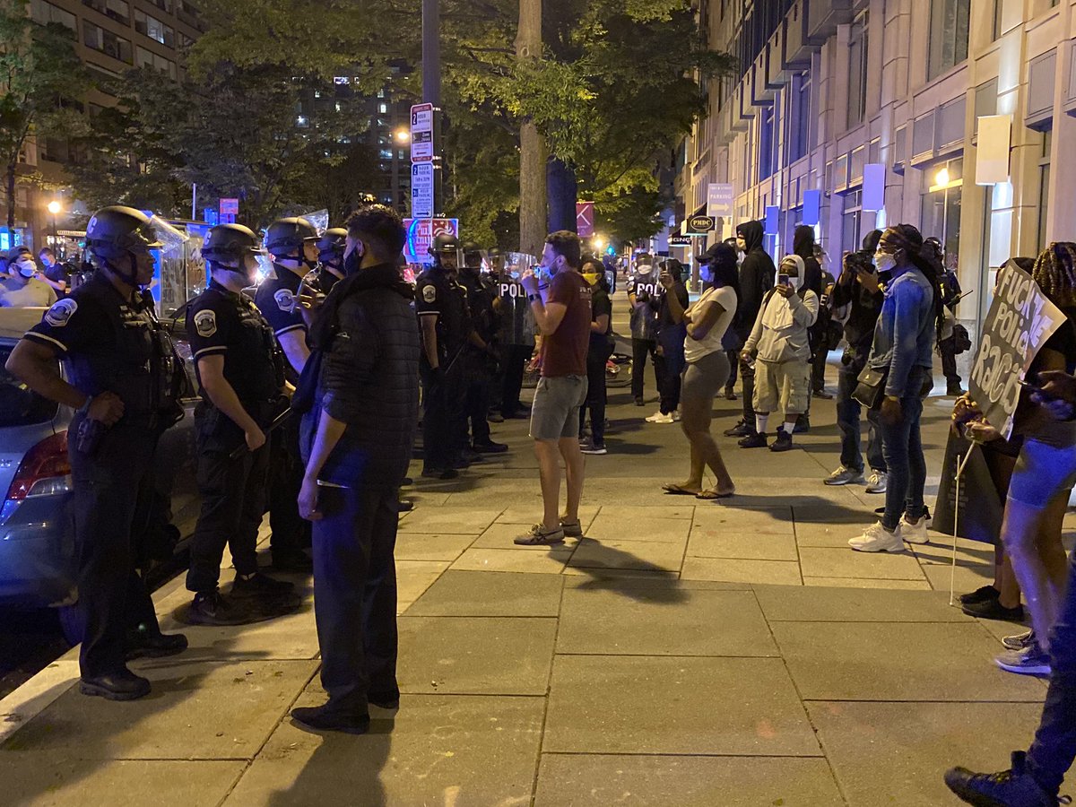 Confrontations continued later in the evening between police and protesters at 16th and H streets NW, where police pushed demonstrators back from behind barricades. The D.C. National Guard were deployed to the area as the sun began to set, joining Secret Service, D.C. police and U.S. Park Police in the area surrounding the White House.
