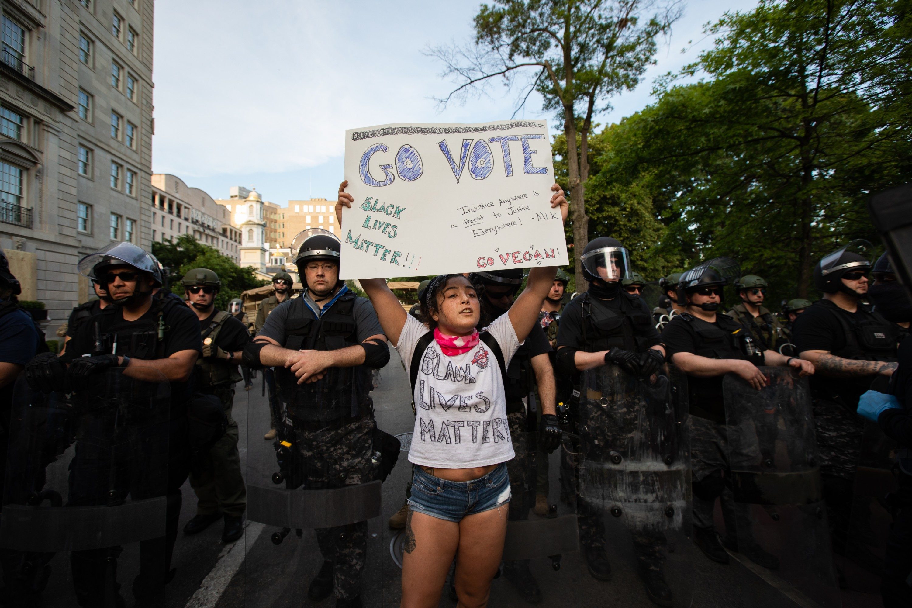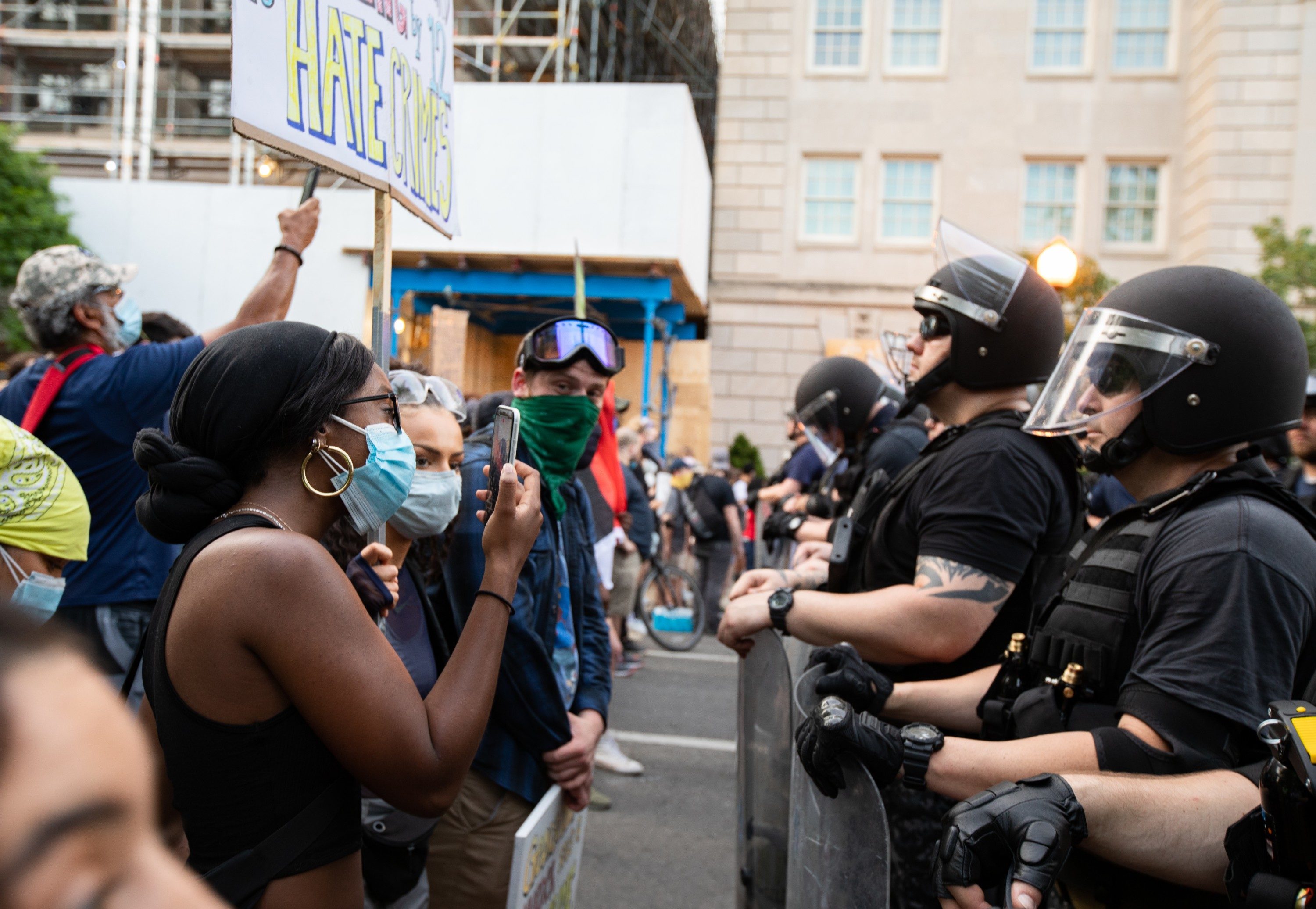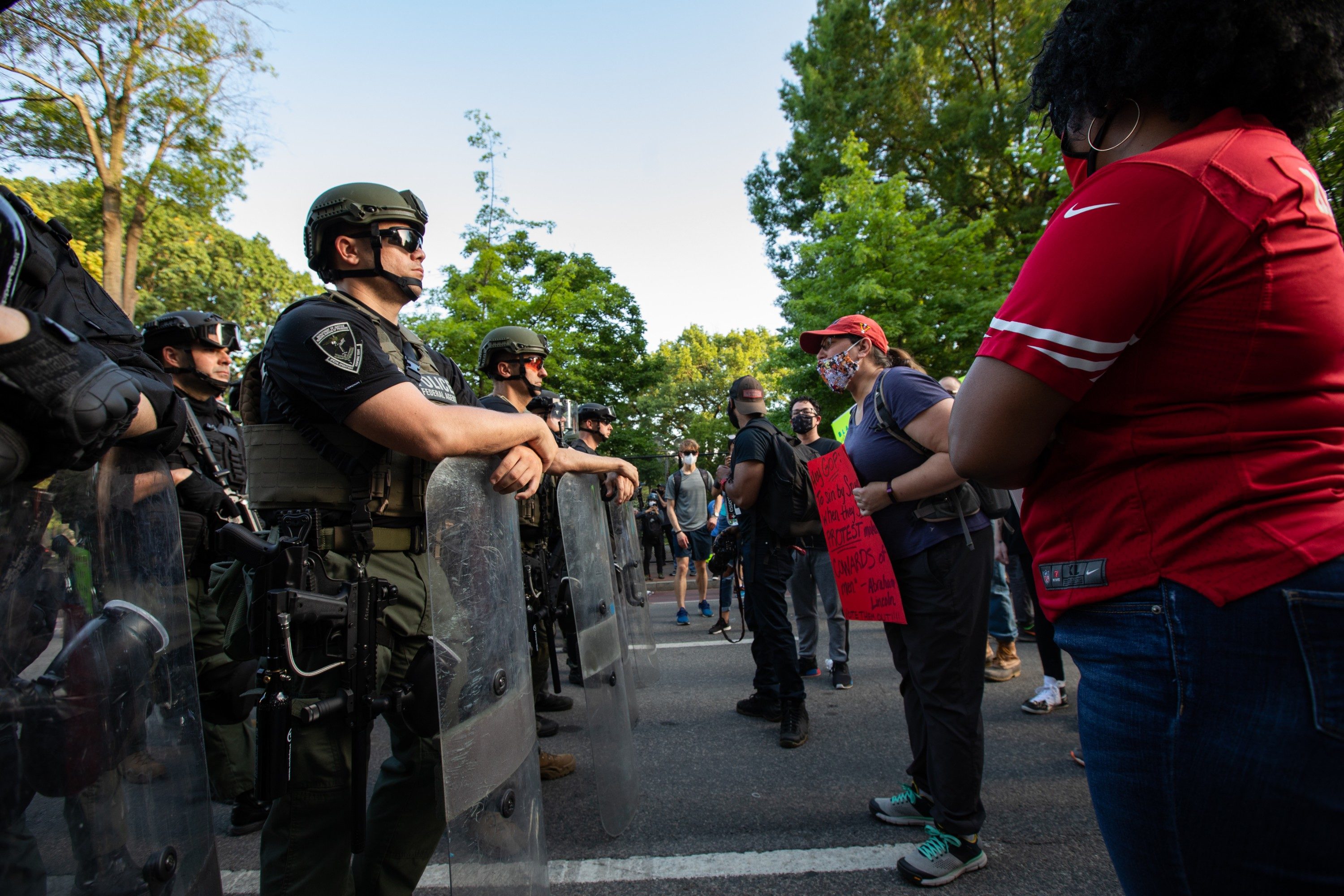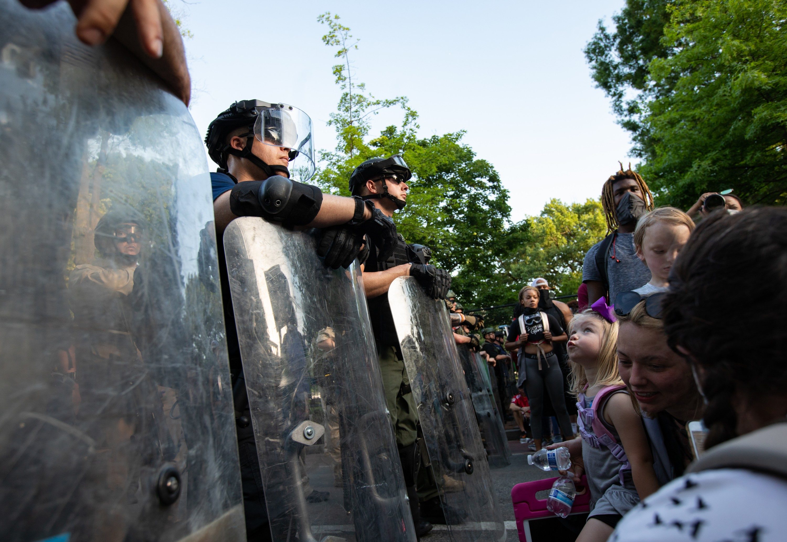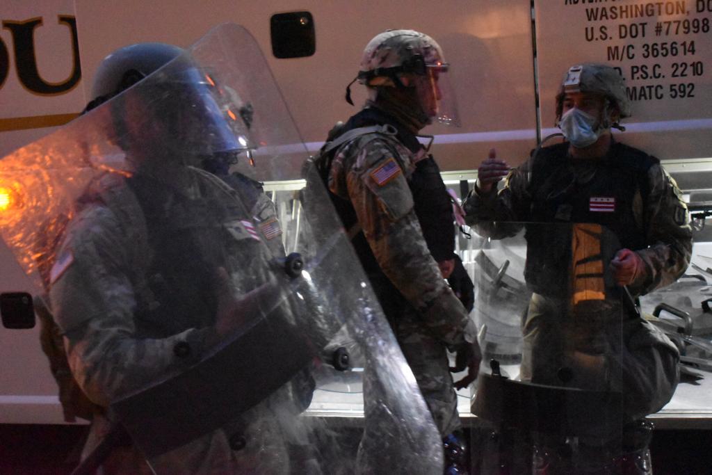 Still, the crowds on Wednesday—the largest yet in the protests against police brutality in D.C.—were surrounded by a huge law enforcement presence, larger than in previous nights. Just before sunset, buses full of military forces that appeared to be national guardsmen were seen pulling up to the areas around the White House. They were wearing shields and carrying batons. As night fell, some guardsmen were seen getting back on the buses, while others stayed near the White House.