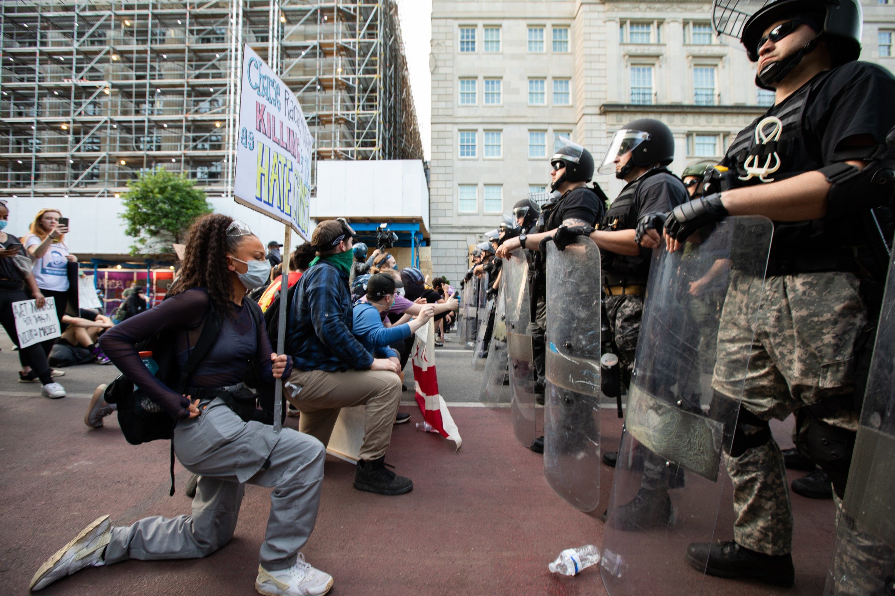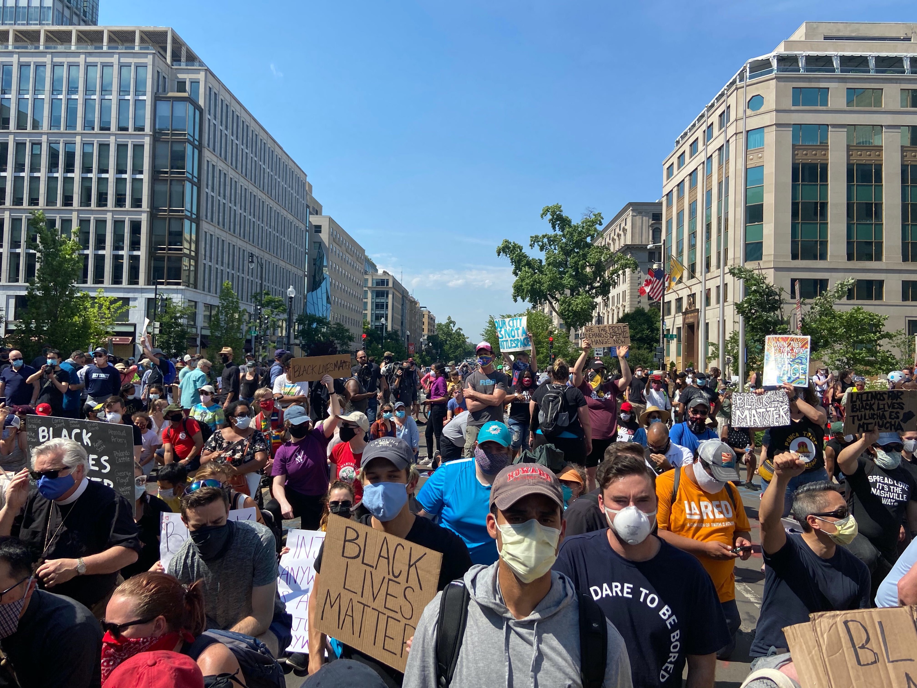 Protesters engaged in heated verbal confrontations with the National Guard and police officers guarding the line to the White House, but the protest remained peaceful. Some protesters were seen kneeling in a line in front of police, per photos shared on social media.