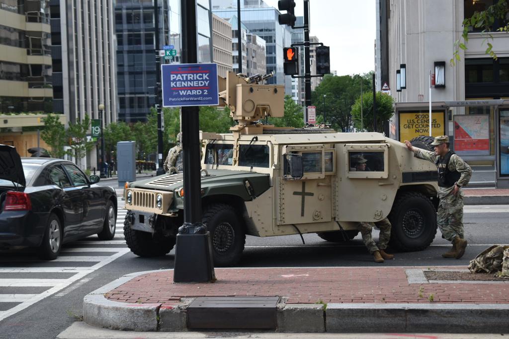 Video from @WhyBlitz showing military forces near the protests happening downtown. They appear to be national guardsmen, and have been arriving in droves on tour buses. pic.twitter.com/OjttpUjSkZ