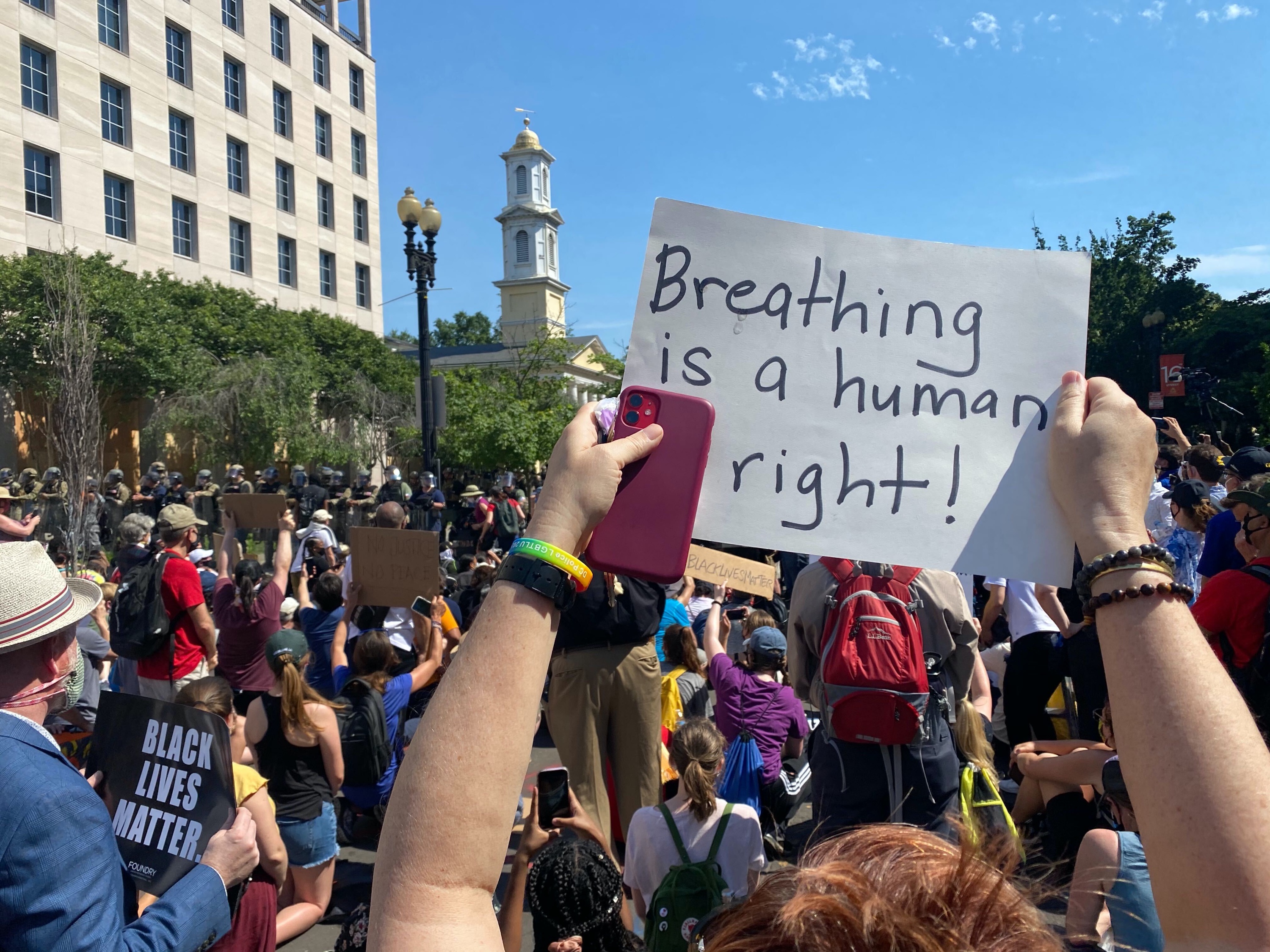 In front of the White House about half an hour after curfew, some protesters spotted figures that they presumed to be law enforcement on top of a nearby building and chanted, “Get off the roof,” and “Peaceful protest,” per videos on Twitter. A protester shined a spotlight on the building to find the figures observing the crowd from above, reported WTOP journalist Alejandro Alvarez. Someone also projected the words “Badge ≠ License to Kill” on St. John’s Church, where President Donald Trump posed for photos on Monday night.