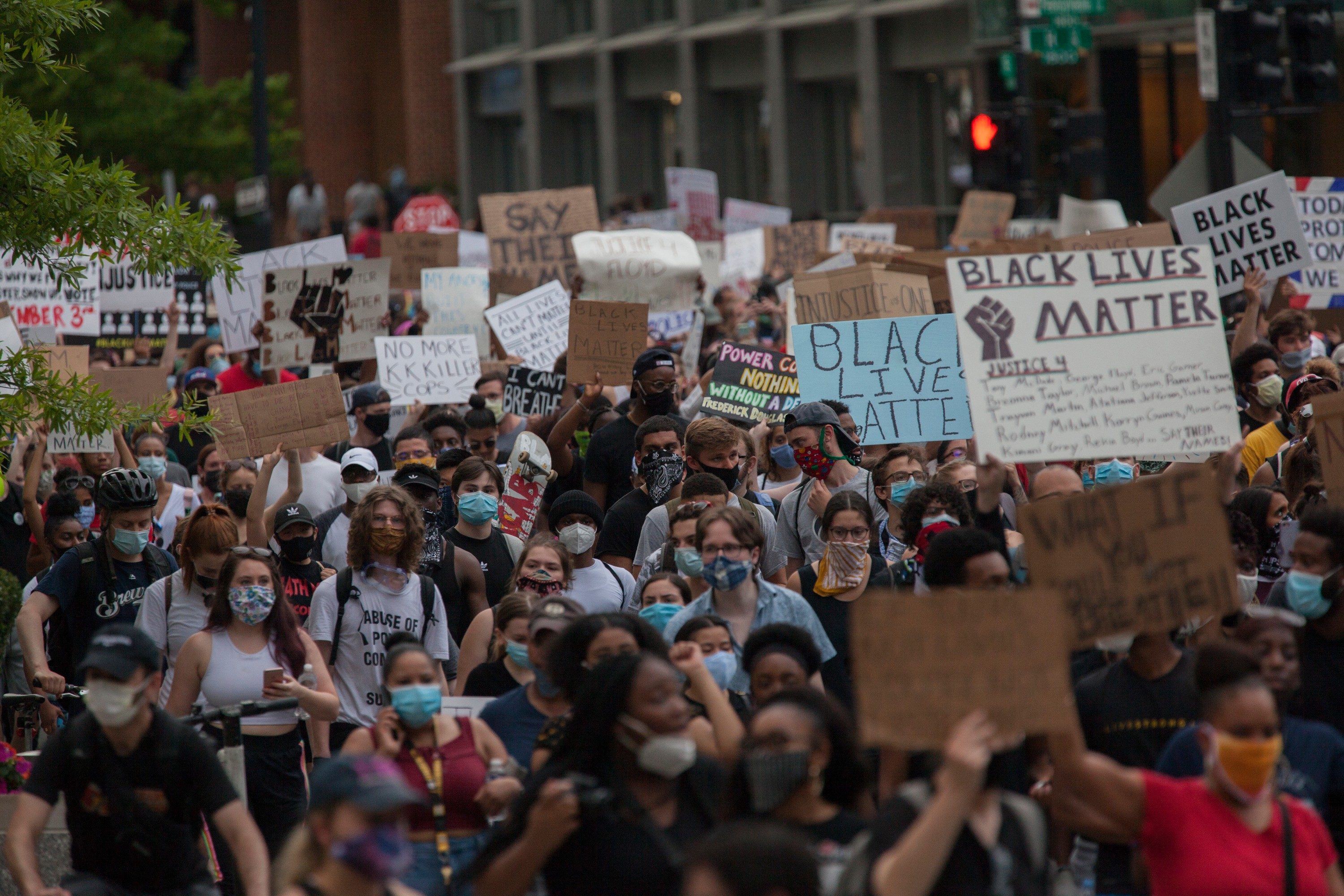 A couple hundred people, some in rain ponchos, remained outside Lafayette Square after the downpour. They clapped and chanted, “This is what democracy looks like.” Demonstrators pressed against a fence recently placed around Lafayette Square, protesting police brutality and racism, and shouting at police who were barely visible in the distance. They were joined by a group of marchers who, at one point, chanted “We can do this all night.”