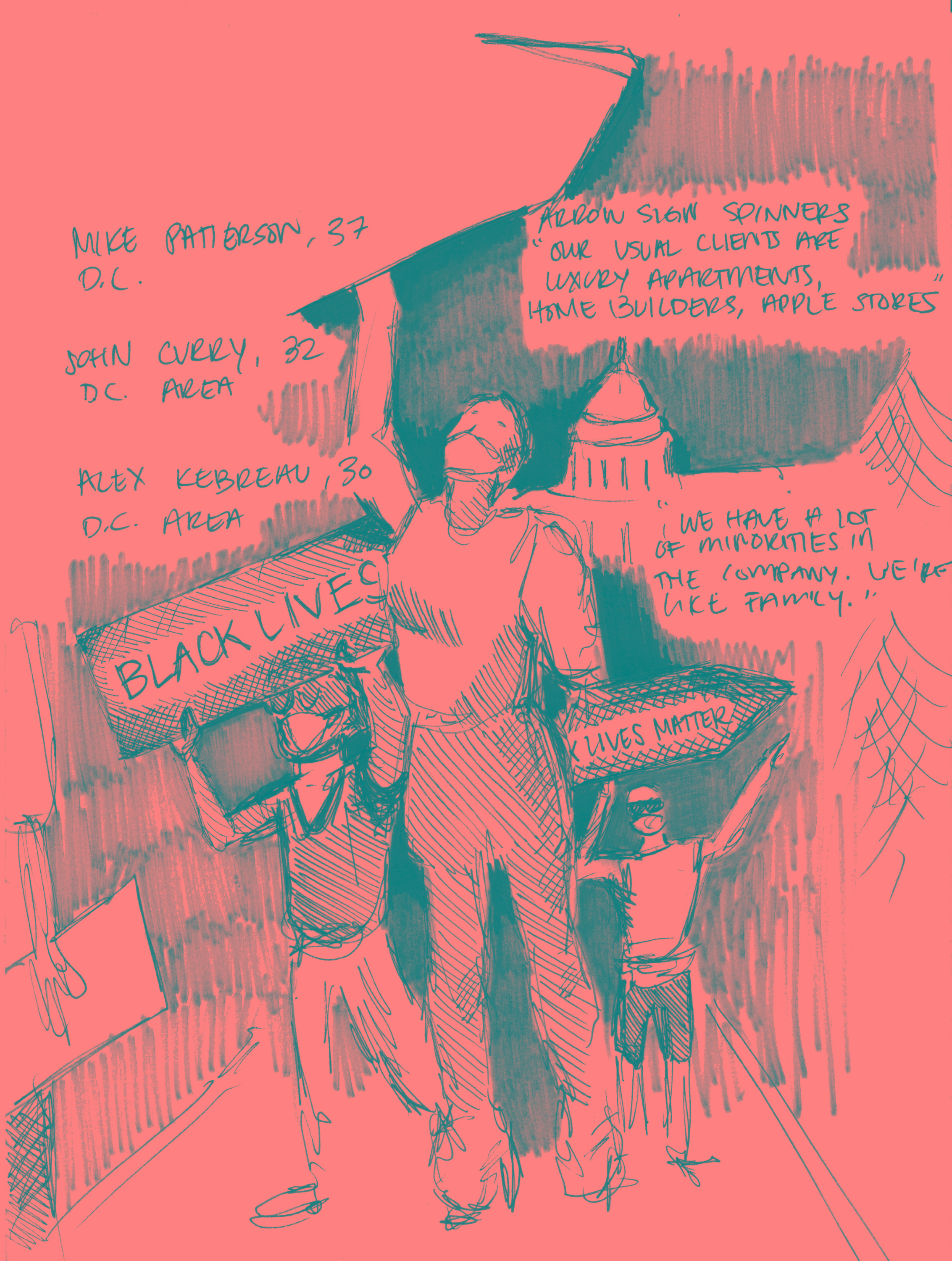 Near the U.S. Capitol at Constitution and 3rd Street, N.W., sign spinners twirling signs reading “Black Lives Matter” and “Never Forget” drew the delight of those passing through.
