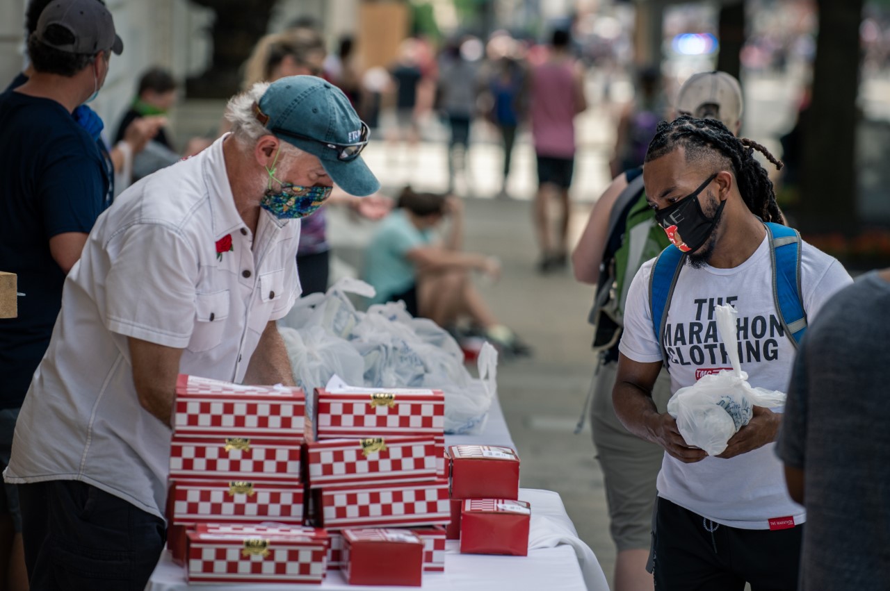 Frank Mills, the beverage director of the fried chicken and oyster restaurant Roy Boys, has been providing protesters with free chicken sandwiches near Lafayette Square since June 2, and plans to continue showing up downtown for however long the protests last. As a son of two parents from Ghana, Mills says he wanted to stand with others who were fighting against the systemic mistreatment of black Americans, and be there to help in whatever way he could.