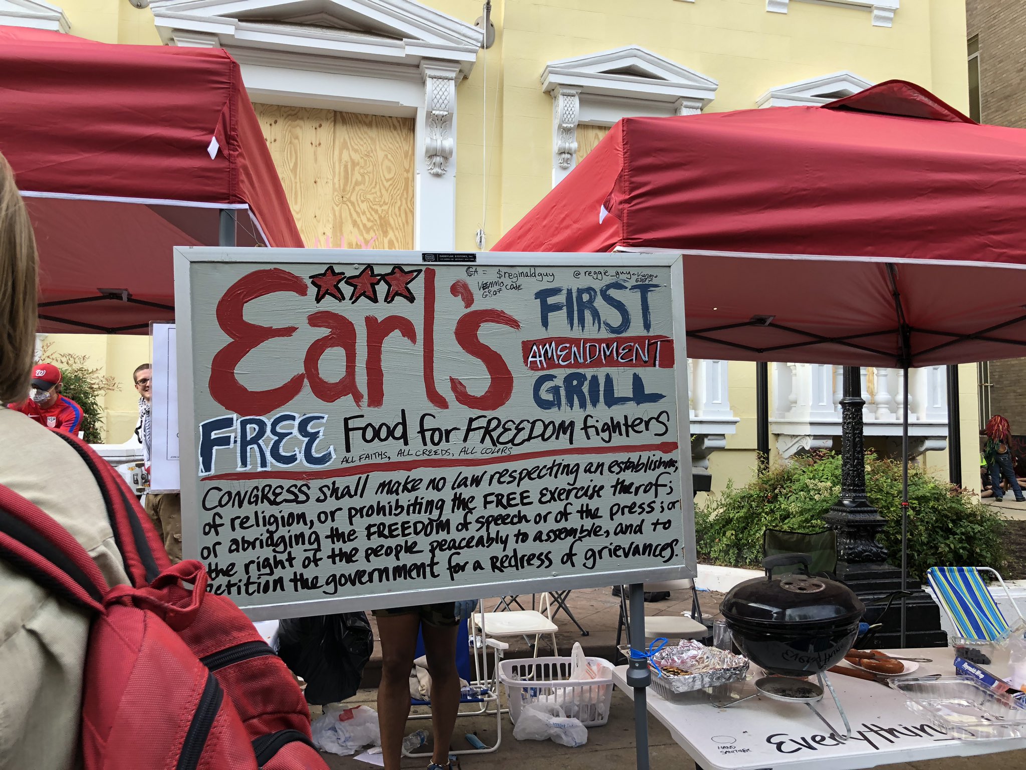 Outside of St. John’s Church, a pop-up hot dog stand dubbed “Earl’s First Amendment Grill” served hot dogs and hamburgers to those descending on Black Lives Matter Plaza. Earl’s founder Reggie Guy says that Earl’s Grill is a place for everyone, unifying in one community.