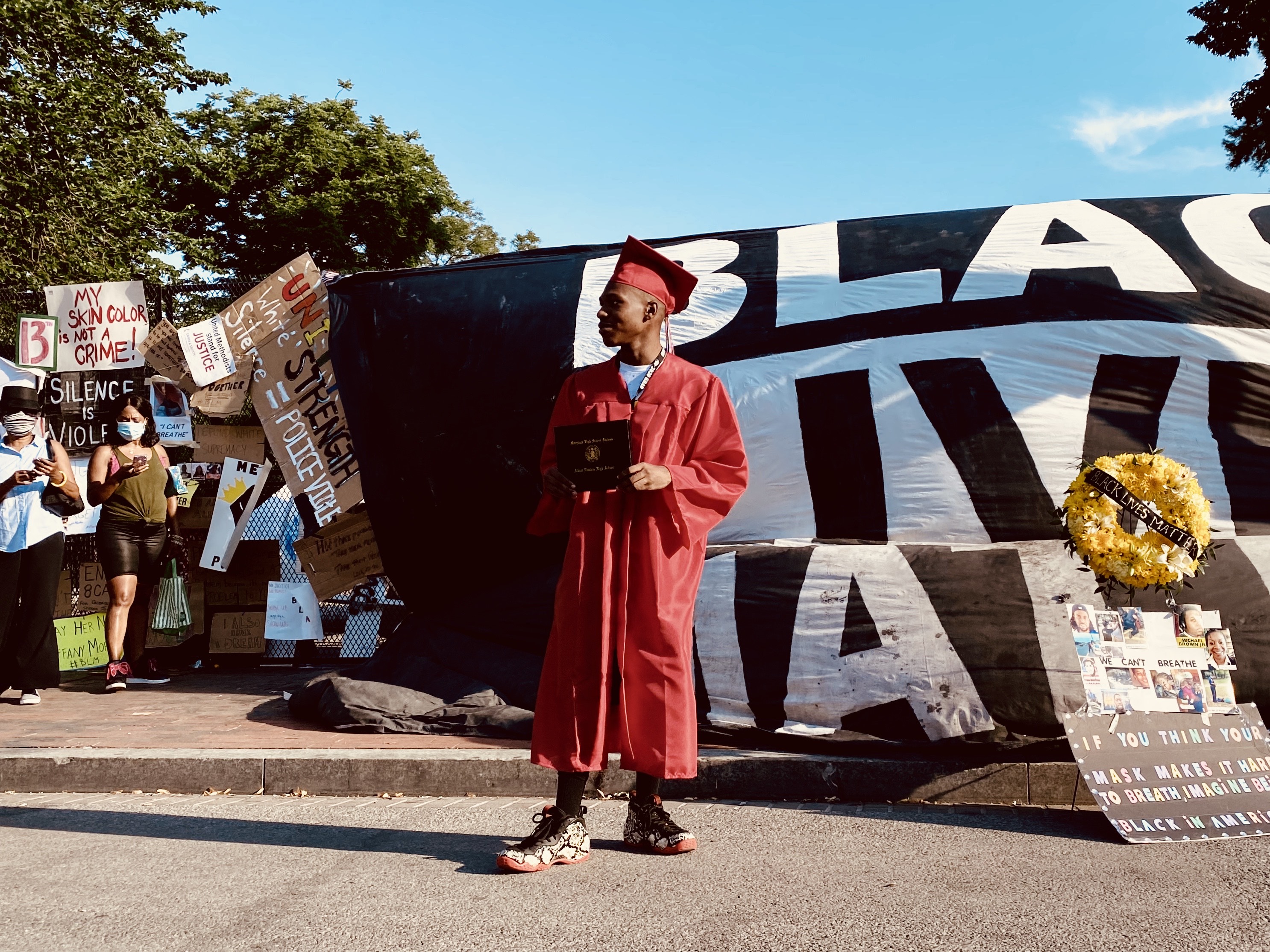 Tuesday also saw newcomers. Christian Stevenson, a D.C.-native who just graduated from Albert Einstein High School, came down to Black Lives Matter Plaza for the first time to celebrate in his cap and gown. The crowd cheered for him as he posed for photos. “I see this — everyone coming together doing this amazing thing. It’s fantastic,” he said. “[I’m] very inspired. This is a long time coming honestly … Everyone wants equality in America, everyone wants America to change. People are tired, we are tired, we want this to be a better place.”