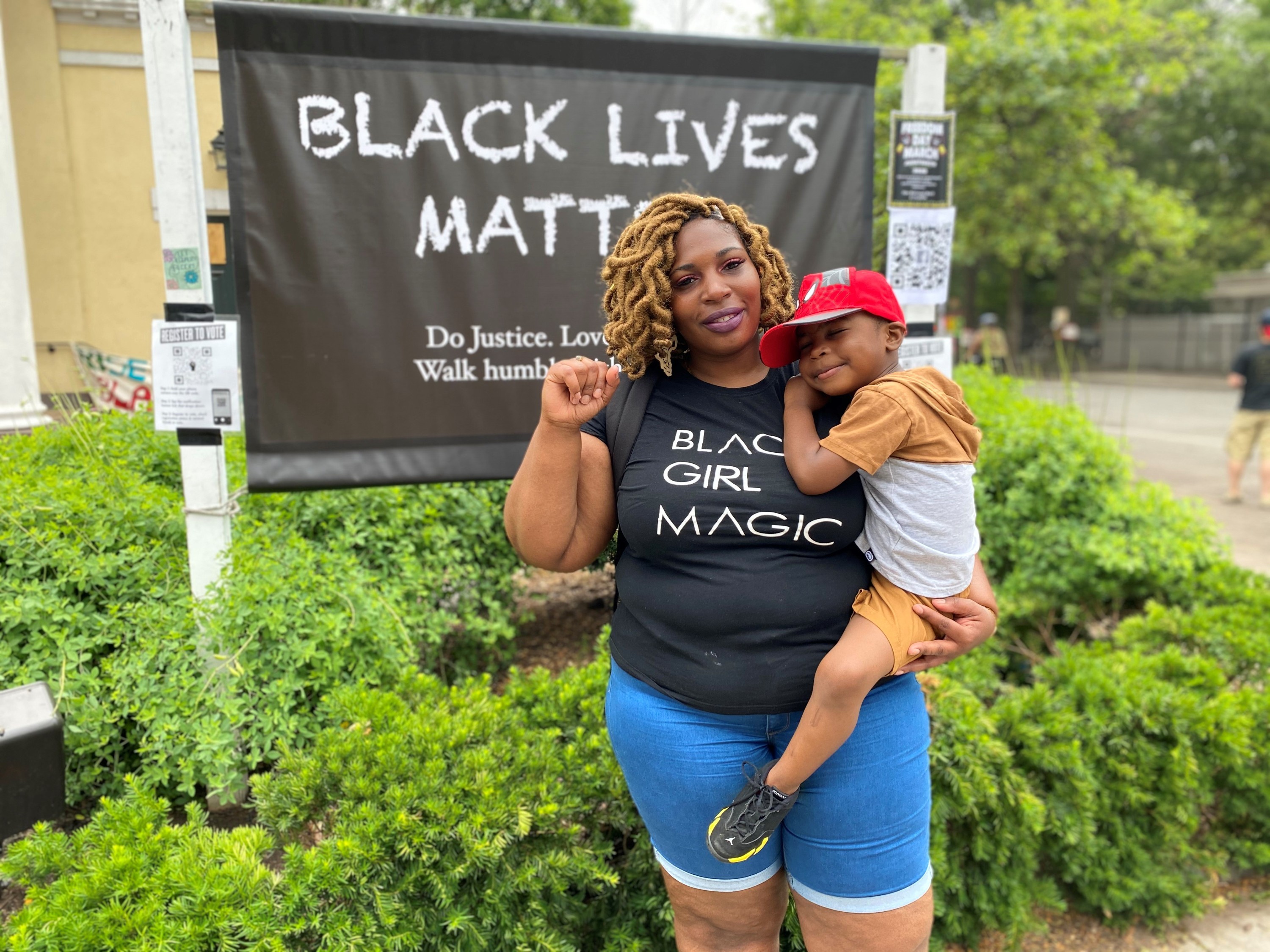 “Over there, I saw a Caucasian lady, her sister and all their kids,” she said. “They hand made these posters just spreading messages of love and support and Black Lives Matter … this is where we begin to bridge the gap in between love and hate.”