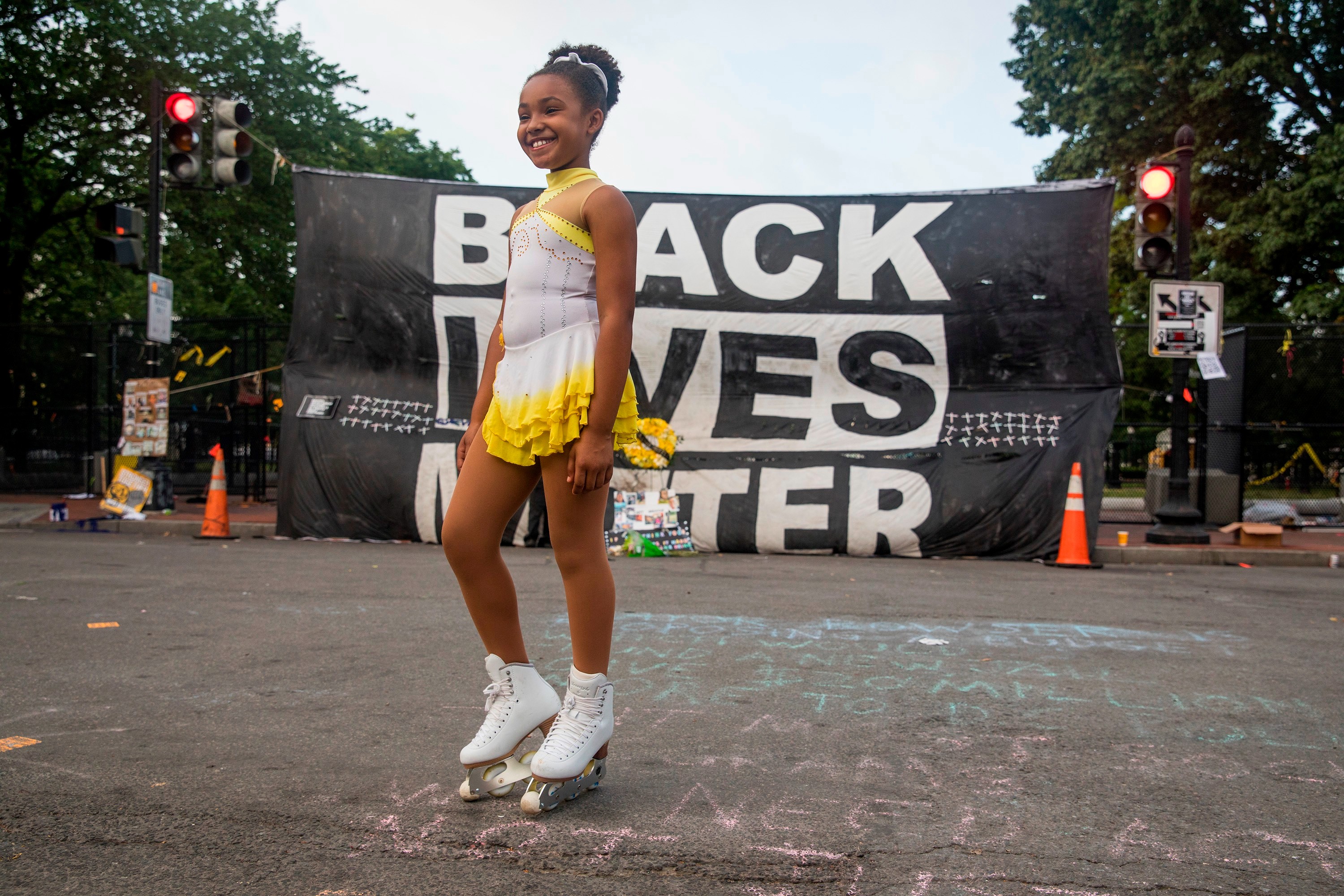For other families, the memorial served as a reminder of their vitality. Katrice Saunders, a consultant, brought her 9-year-old daughter to Black Lives Matter Plaza for the thrill of figure skating at the historic spot. Kaitlyn spun in a white and yellow dress, her hair pulled high above her head. Behind her, a banner proclaiming “Black Lives Matter” hung from two traffic lights, obscuring the view of the White House.