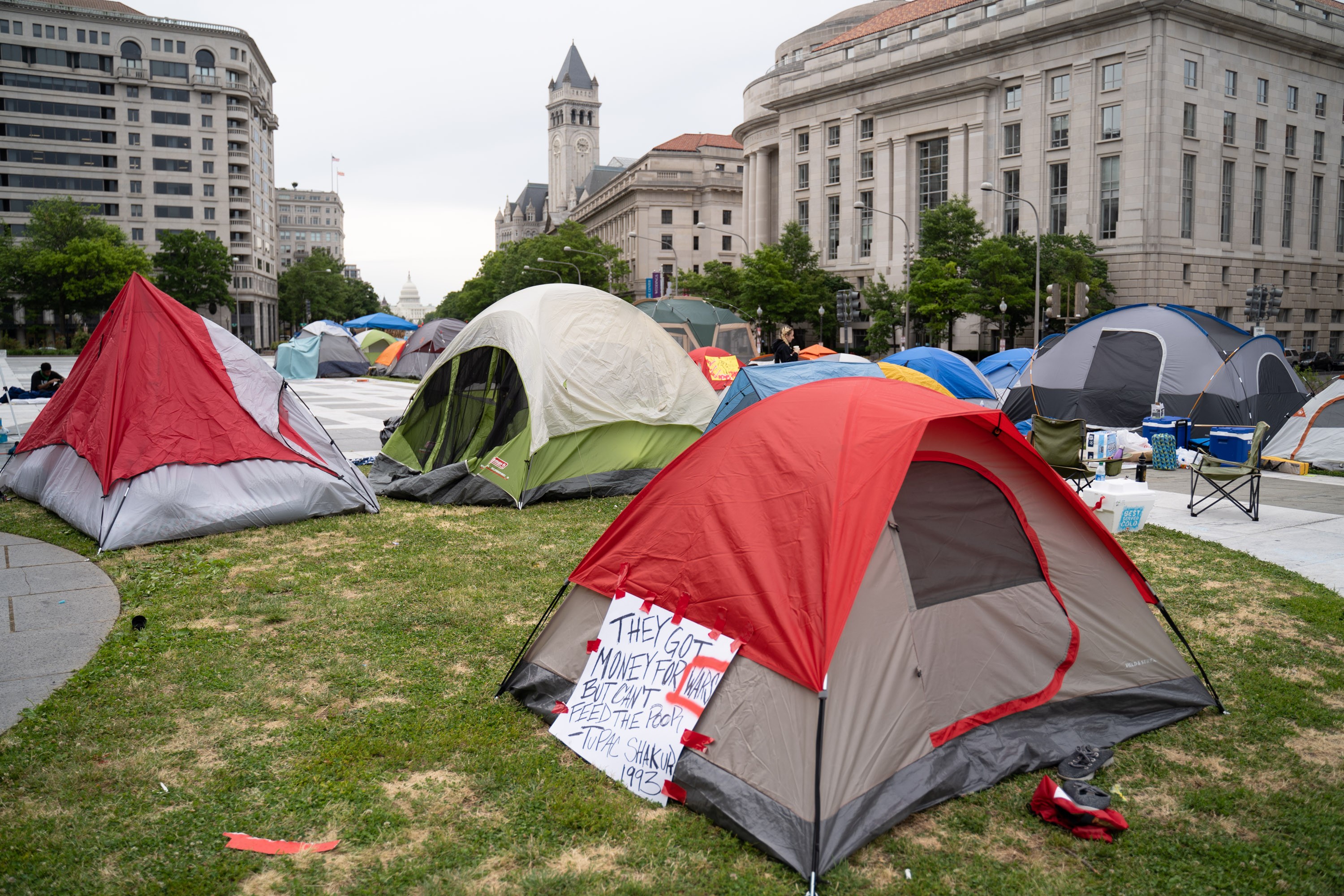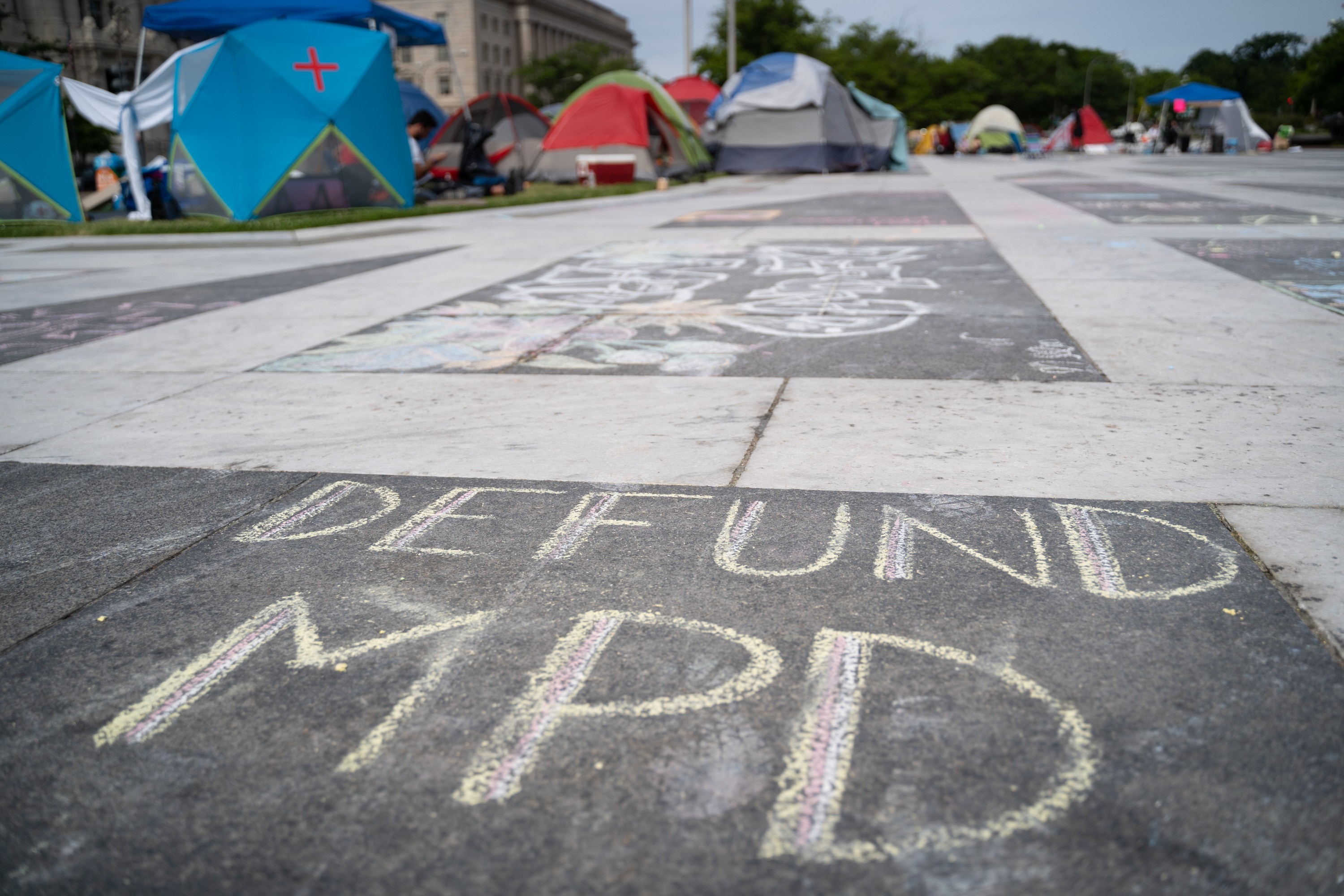 While the D.C. Council held a virtual hearing on the Metropolitan Police Department budget on Monday morning, about 40 protesters set up a couple dozen tents outside the empty Wilson Building, where the council normally conducts its affairs. Many of those gathered were not able to testify before the council. (500 people signed up to testify, but there was only time for 90 of them.) So protesters held an impromptu hearing of their own.