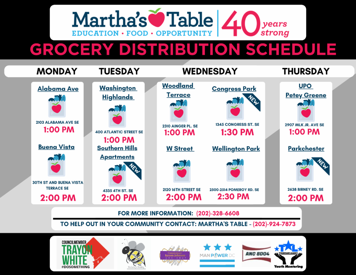 Every week, Monday through Thursday, Martha’s Table distributes groceries in Wards 7 and 8 through a total of 10 grab-and-go grocery sites it has opened during the coronavirus public health emergency. In the past three months, the nonprofit says it has distributed 70,000 free meals (grocery bags contain multiple meals) across the two wards in partnership with organizations including the Capital Area Food Bank, D.C. public and charter schools, the Office of the D.C. Attorney General, and Ward 8 Councilmember Trayon White’s office.