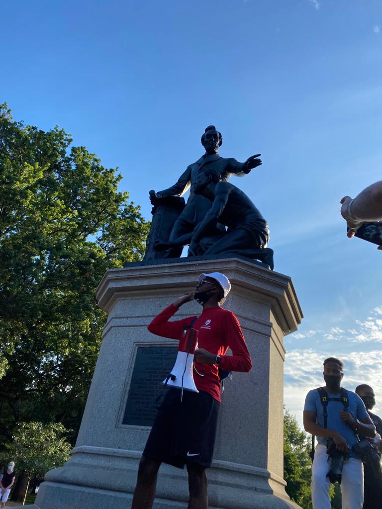 At the base of the monument, Glenn Foster, 20, a rising junior studying government at Harvard University, shouted that the statue embodies white supremacy and the disempowerment of Black people. Foster helped organize the demonstration and said he’s the founder of the Freedom Neighborhood, which describes itself as “a youth-led revolution for our generation” on its Instagram profile.
