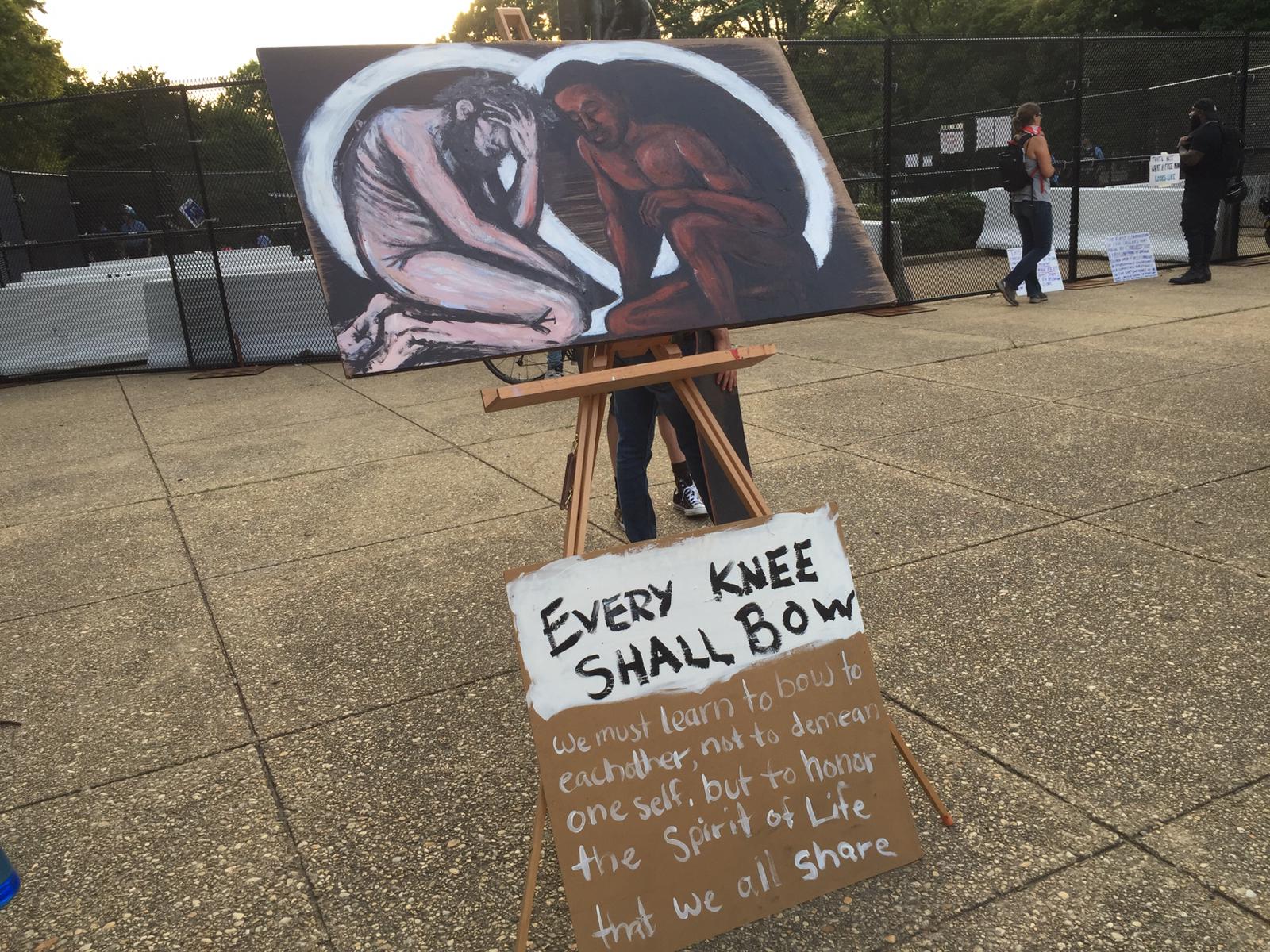 “That man [in the statue] is on one knee. That man is rising,” she said. “He’s not in submission, his back is not bent. Look at him — his face is looking skyward. He’s looking forward to the future of freedom.”