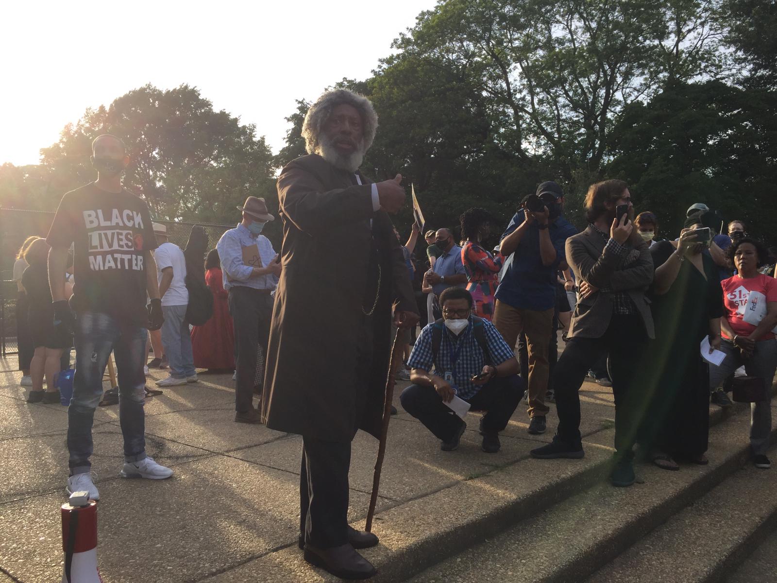 By 7 p.m., protesters began delivering speeches. Most spoke in favor of removing the statue, and the crowd cheered for people who spoke about the importance of recognizing the agency of Black people in gaining their own freedom from slavery. But others, particularly the group of historians, objected to calls for the removal of the statue, calling instead for adding historical context or erecting other statues that would offer a counterpoint.