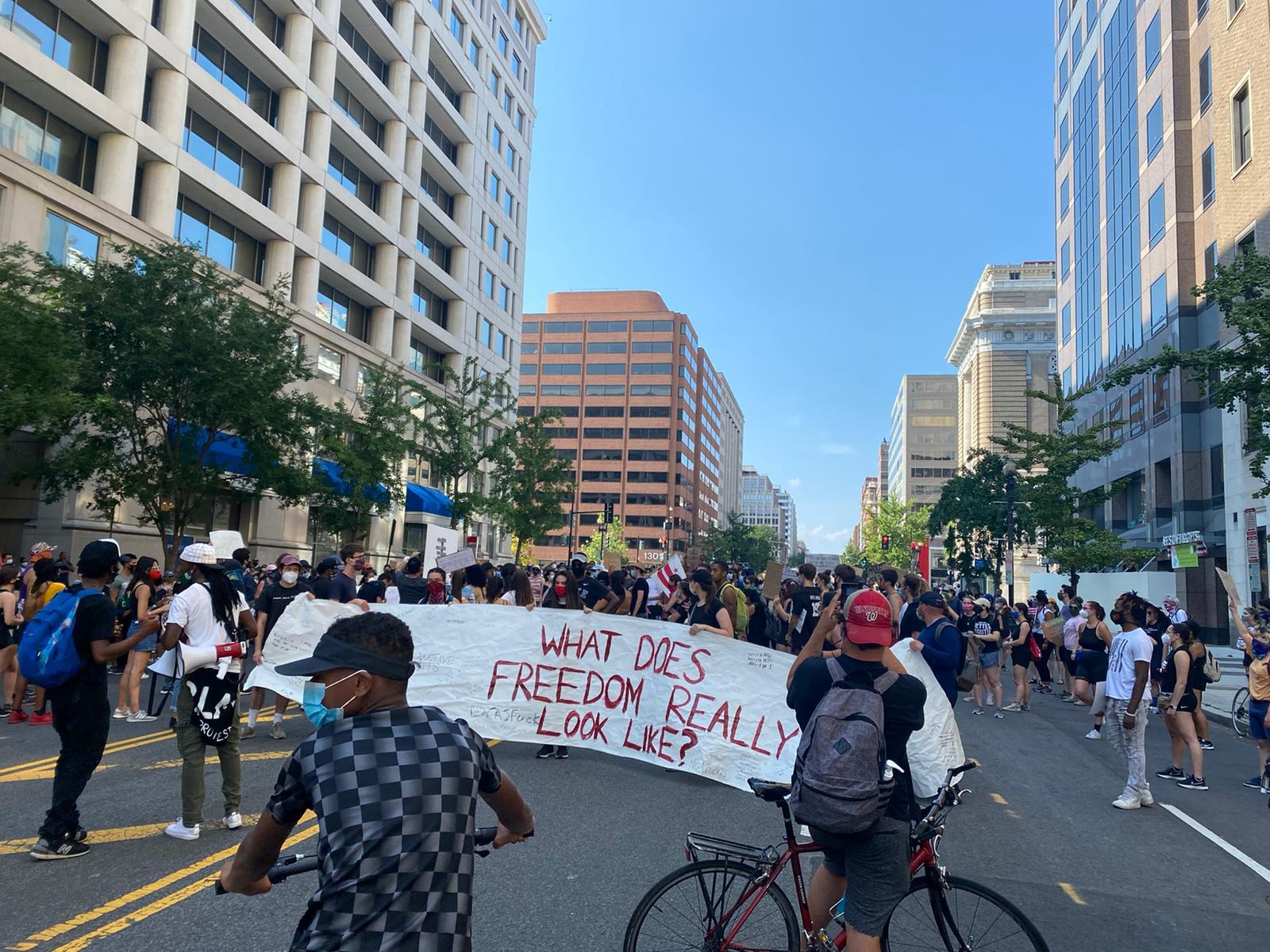 “Freedom means a right to express yourself. A right to walk out here and demonstrate in a peaceful manner. Freedom means that you can speak truth to power without any repercussions. … everything opposite of oppression is freedom.”